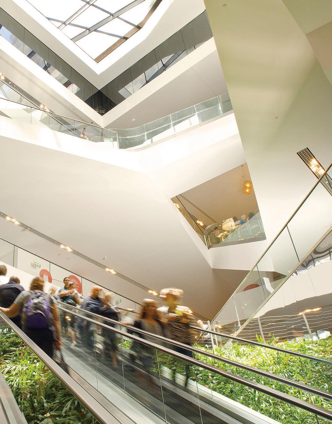 These types of spaces help us prospect (observe) without being seen (refuge). Designing an office or college building to have a number of sheltering spaces and nooks in a built environment is great for letting people spend time and work by themselves. This could be especially helpful for introverts who enjoy the creativity and energy that comes with solitude. Other elements of “space and place” include designing complex spaces to stimulate creativity, adding transitional zones that connect indoors with outdoors, marking clear points of access (entry and exits), or incorporating the area’s geographic and ecological history.