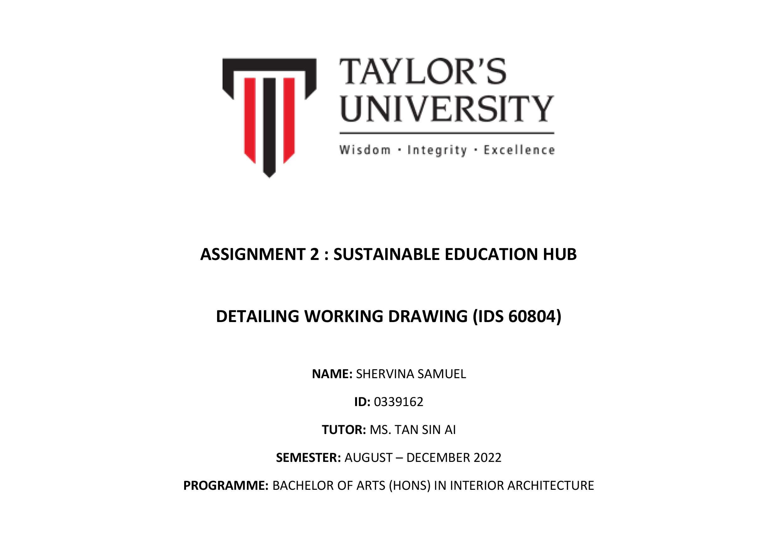 DETAILING WORKING DRAWING (IDS 60804) NAME: SHERVINA SAMUEL ID: 0339162 TUTOR: MS. TAN SIN AI SEMESTER: AUGUST – DECEMBER 2022 PROGRAMME: BACHELOR OF ARTS (HONS) IN INTERIOR ARCHITECTURE