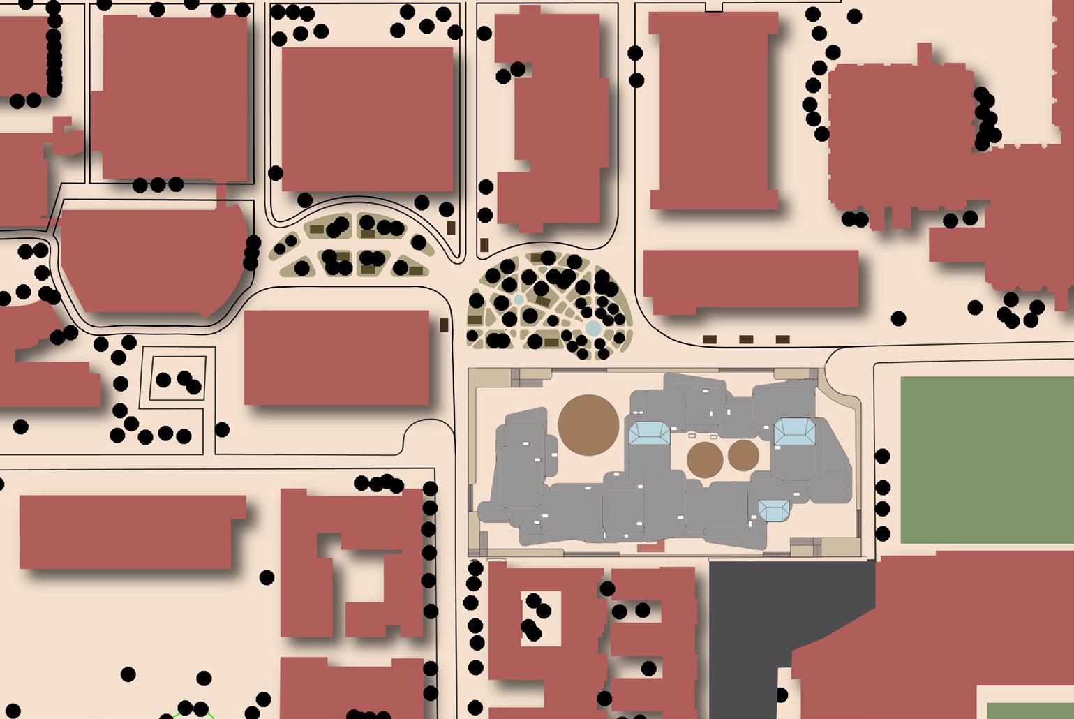 The landscape is reimagined with enhanced walkability, native vegetation, and a rainwater collection system, creating a sustainable and culturally responsive addition to the campus.