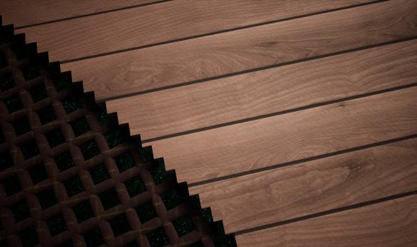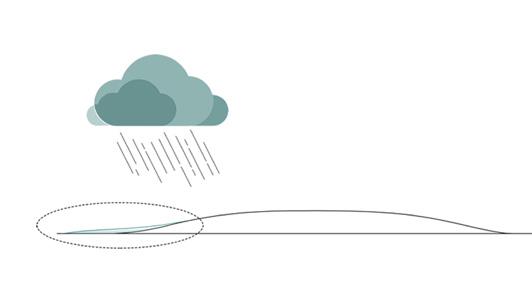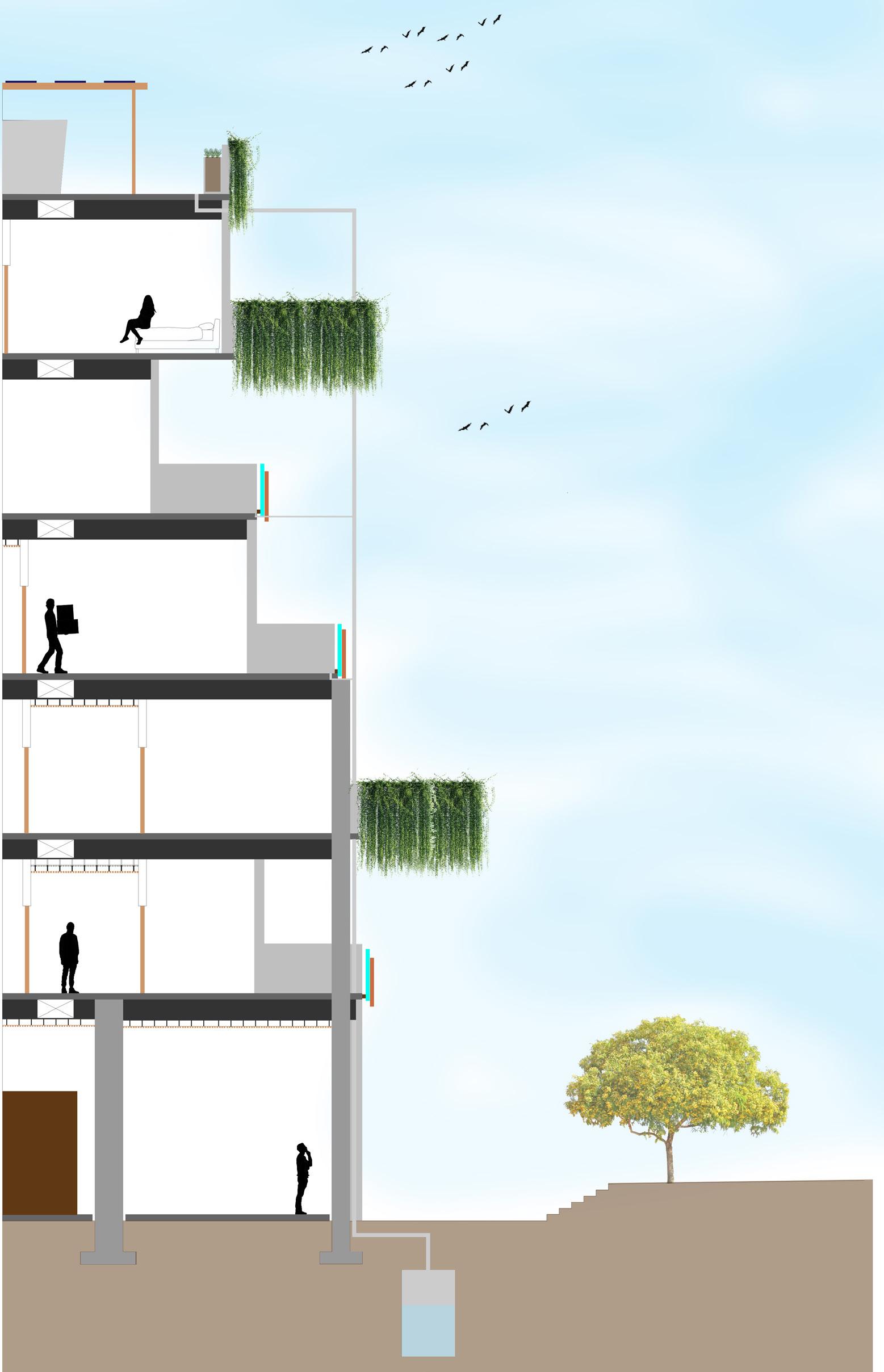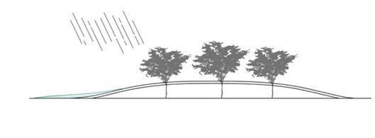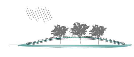 Rainwater is channeled through the wooden structure to irrigate the surrounding trees and plants.