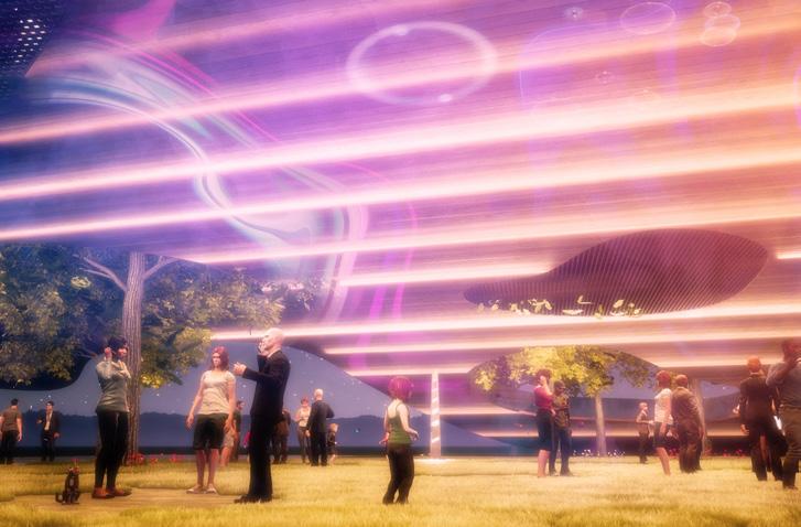 The net hammocks evoke excitement and a sense of dynamic energy, drawing attention to the pavilion and enhancing its vibrant atmosphere.