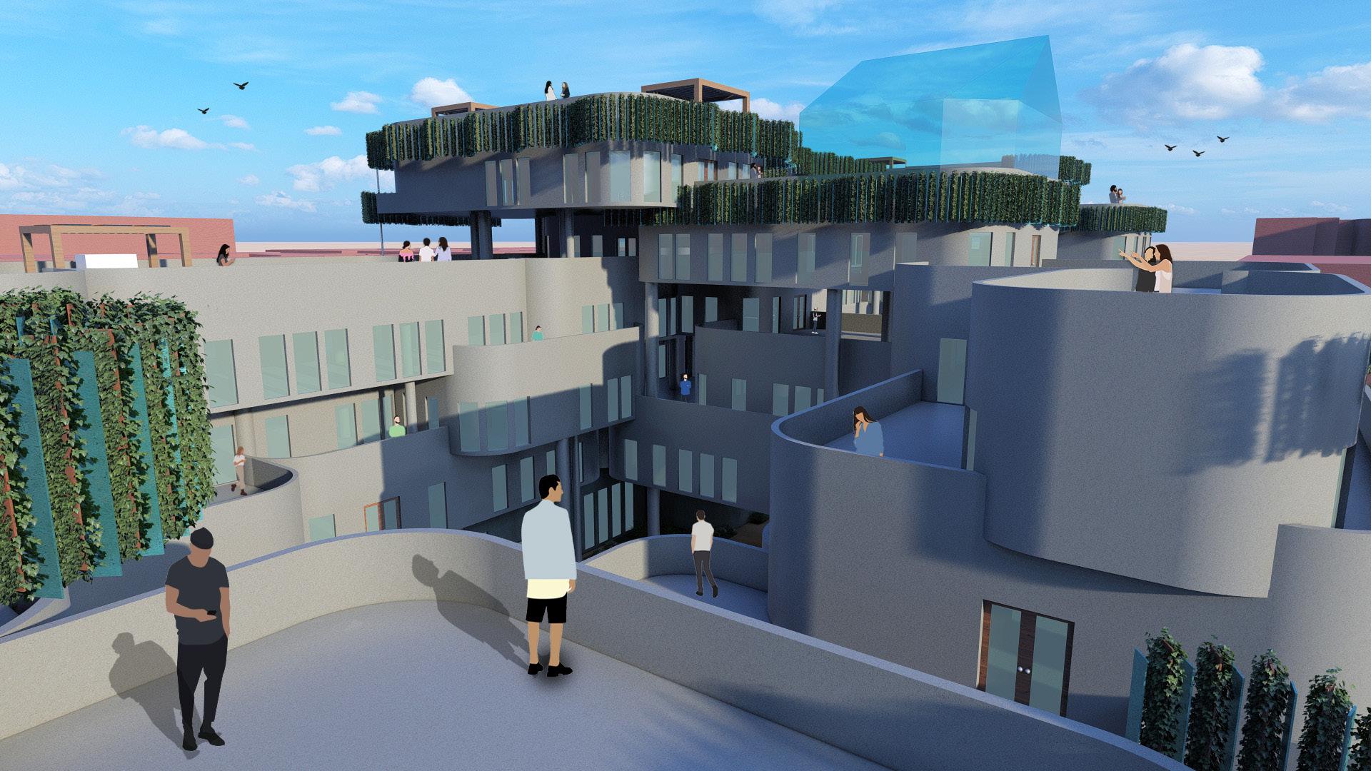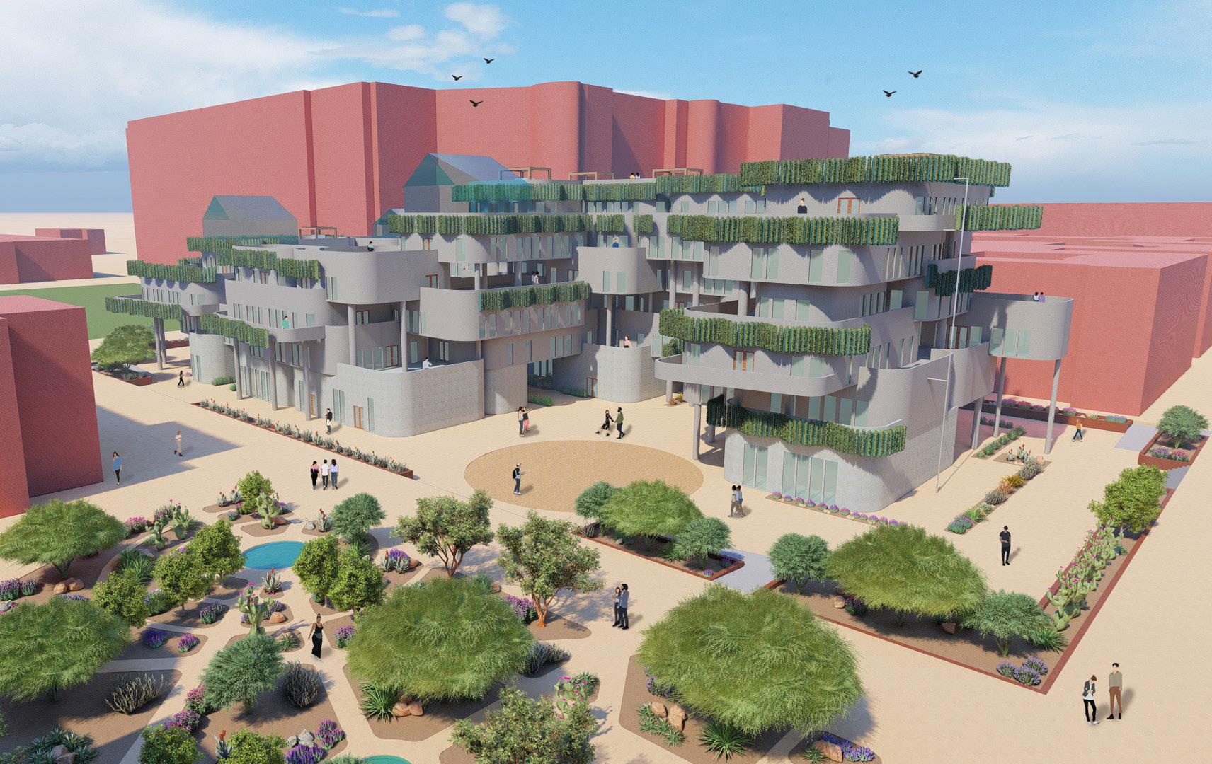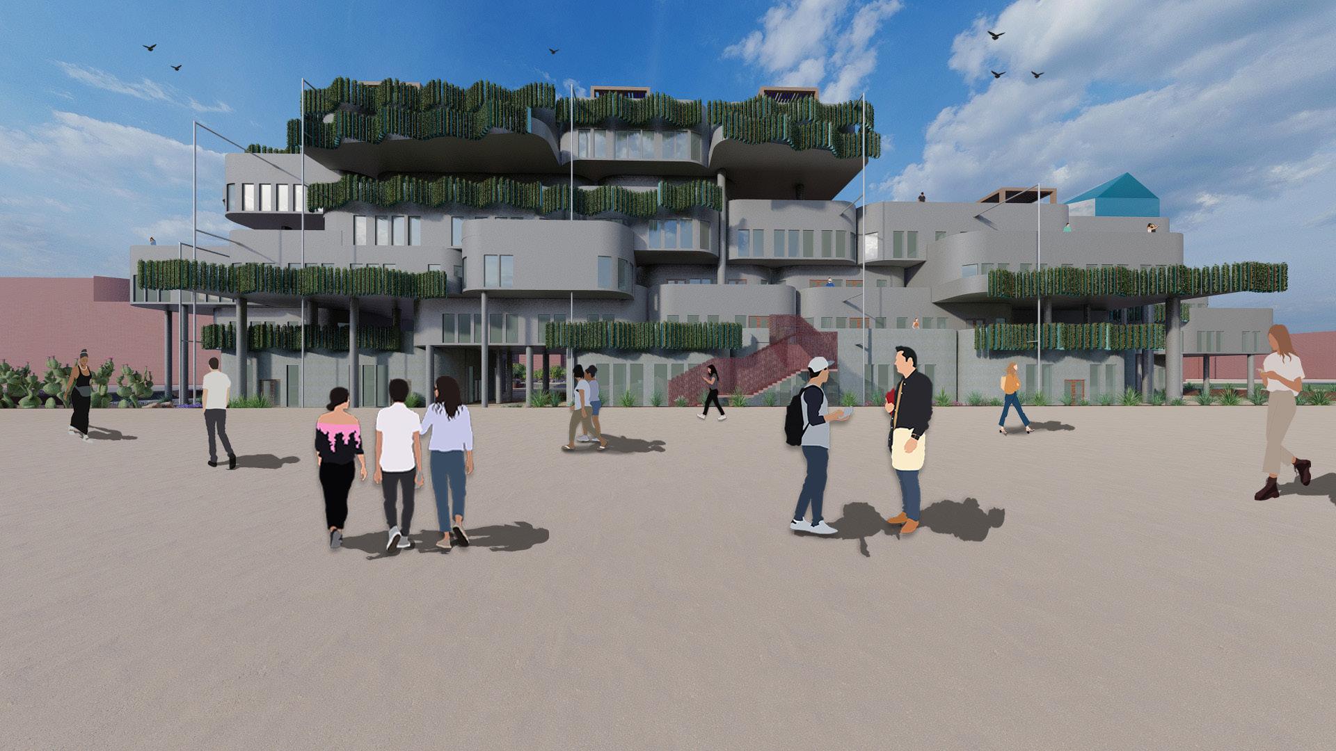 The UArizona Oasis is designed as a home-away-from-home for Native American students, offering a safe environment to practice their culture and celebrate their heritage. Inspired by the concept of an oasis as a place of refuge and renewal, the design features modular pods that create a balanced mix of public and private spaces, fostering a connection to the natural world. The project is set on the site of the existing Graham-Greenlee and Hopi Hall dorms, which are being redeveloped into a new dormitory and community space for Native American students.