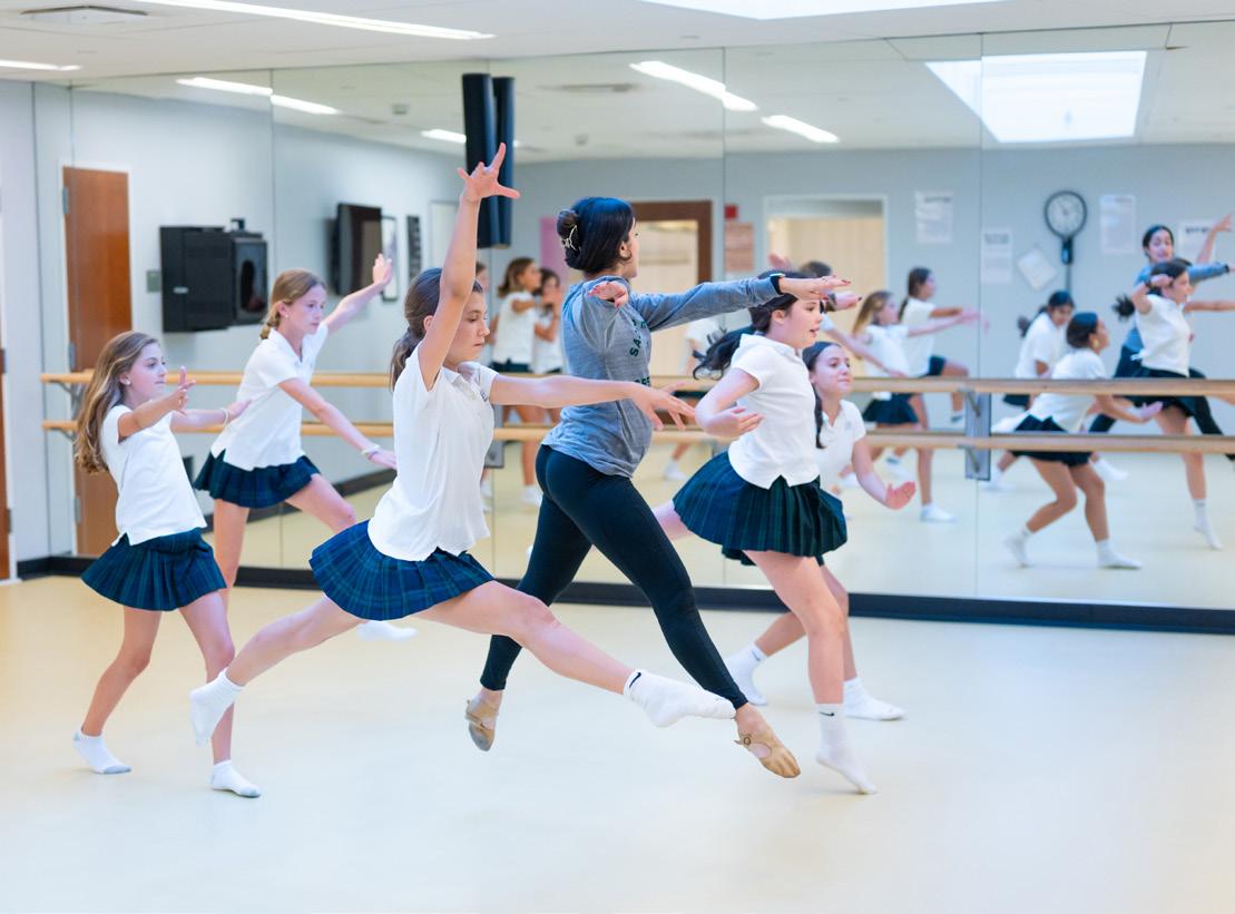 In both Middle and Upper School, the dance program covers a wide range of styles, including ballet, jazz, hiphop, musical theatre, contemporary, and liturgical dance. Within each unit, students concentrate on developing proper technique and learning specific choreography. A key component of the program is exposure, ensuring the girls have the opportunity to try a style they may have never explored, something Zahra N. ’31 has experienced in her Middle School dance mini-course. “It is so much fun learning different styles of dance,” she explained, “and I love it because it gives students an opportunity to experience and try new things. It also gives students a new perspective on dance, and the wise freedom of choosing what to do with their new knowledge.”