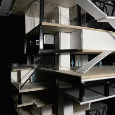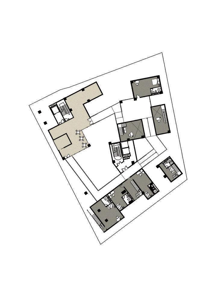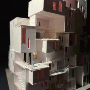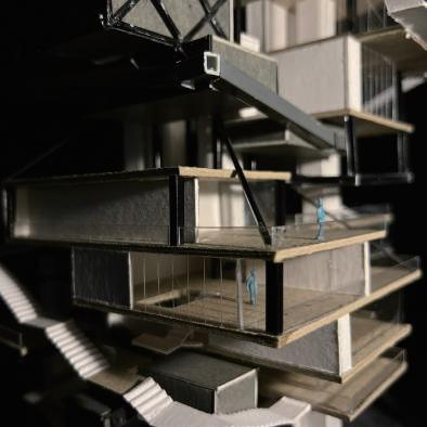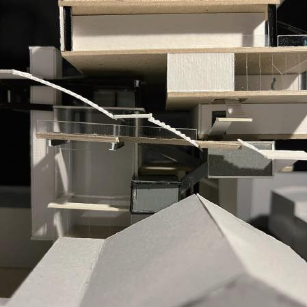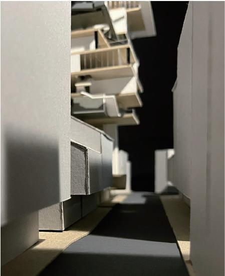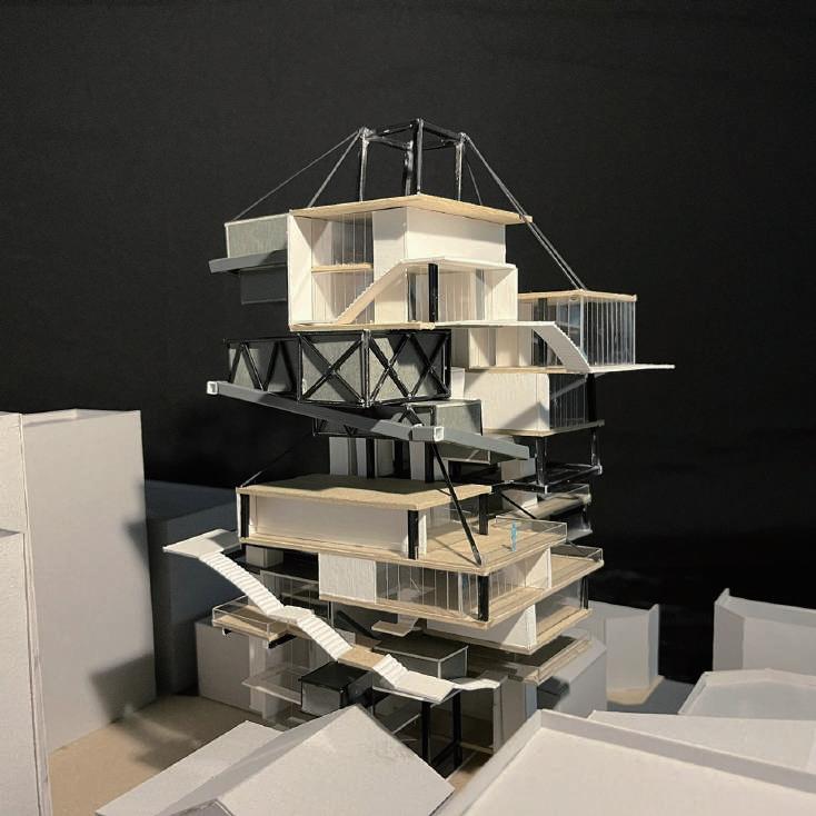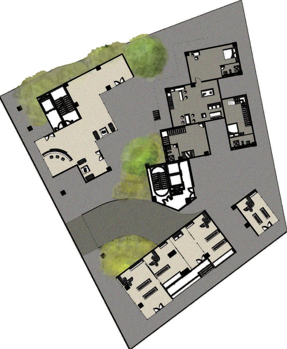 Transitioning from living alone to communal living depends on the degree of openness in private spaces, which determines the ratio of communal units. Once the ratio of each housing unit is determined, three types of unit combinations can be established. To enhance interactions among residents, I aim to create more platforms and walkways that facilitate intersect- ing spaces. Therefore, by stacking and offsetting units vertically and horizontally, additional pathways connecting various units can be created. This idea of multiple pathways leading to different spaces reminds me of an anthill, which is a cohesive spatial typology that requires a central axis. In this design, the public space serves as the axis, and residential units revolve around and envelop the public space. Simultane- ously, natural factors and the height differences between residential and public areas generate three-dimensional cohesion, fostering interactions, dialogue, and a relationship between the tangible and intangible elements.