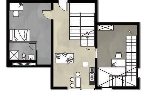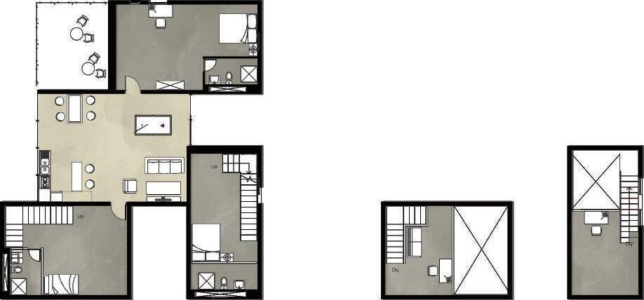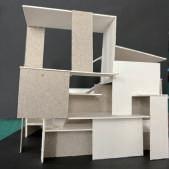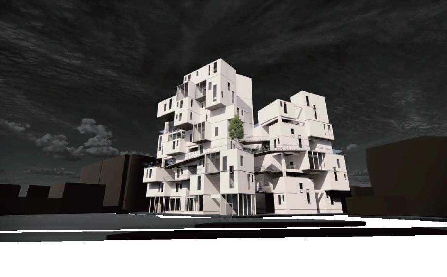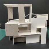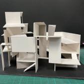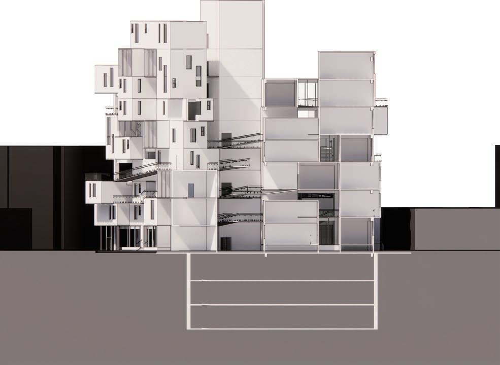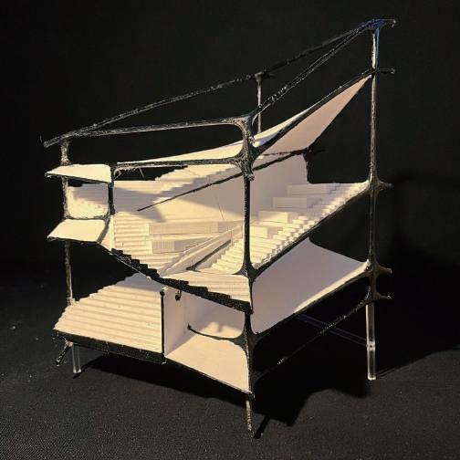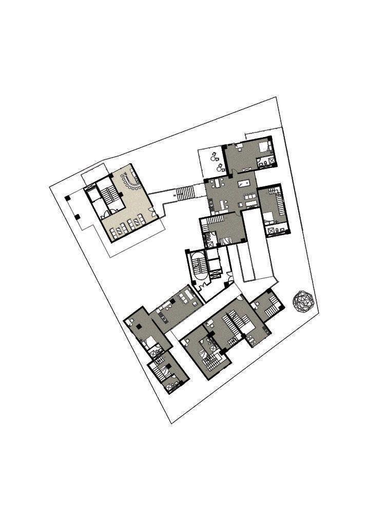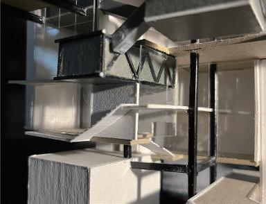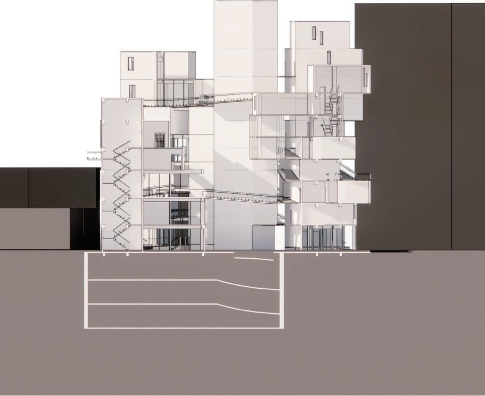 Transitioning from living alone to communal living depends on the degree of openness in private spaces, which determines the ratio of communal units. Once the ratio of each housing unit is determined, three types of unit combinations can be established. To enhance interactions among residents, I aim to create more platforms and walkways that facilitate intersect- ing spaces. Therefore, by stacking and offsetting units vertically and horizontally, additional pathways connecting various units can be created. This idea of multiple pathways leading to different spaces reminds me of an anthill, which is a cohesive spatial typology that requires a central axis. In this design, the public space serves as the axis, and residential units revolve around and envelop the public space. Simultane- ously, natural factors and the height differences between residential and public areas generate three-dimensional cohesion, fostering interactions, dialogue, and a relationship between the tangible and intangible elements.