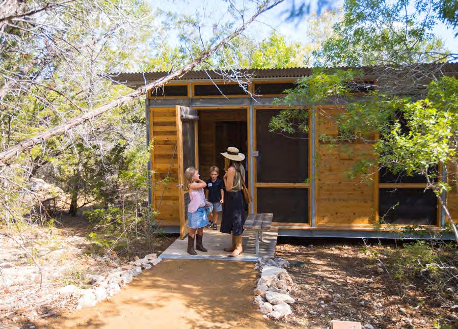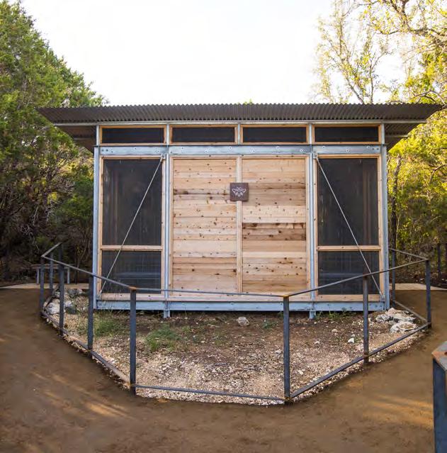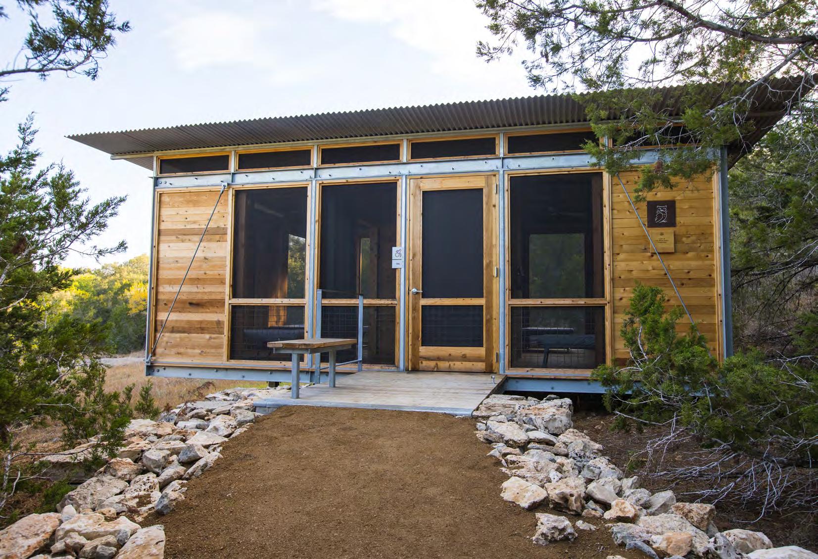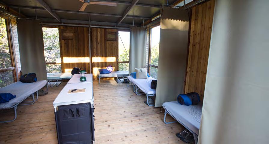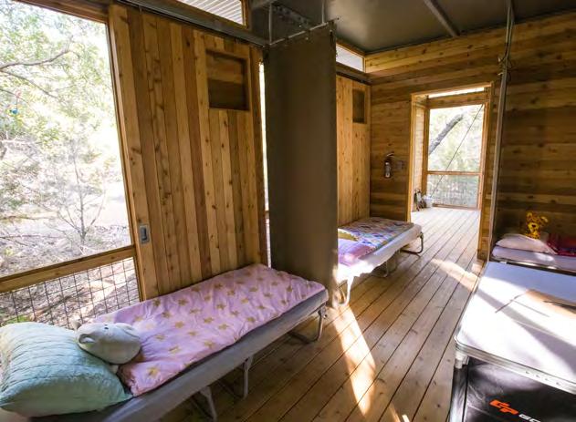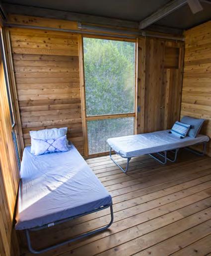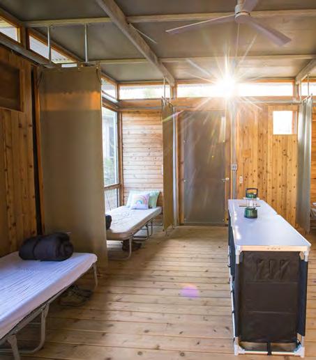 The Campsite’s screened sleeping shelters offer a variety of options for overnight group sizes and needs. Each shelter is named for an animal and is grouped by Land and Sky neighborhoods. All shelters include full-size cots with vinyl mattresses, roll-down canvas dividers, storage cubbies, an overhead fan, many floor-to-ceiling screens that can be covered by barn doors with windows, and a floor light at entry. Shelters do not have climate control or electrical outlets. No linens, bedding, or toiletries are provided.