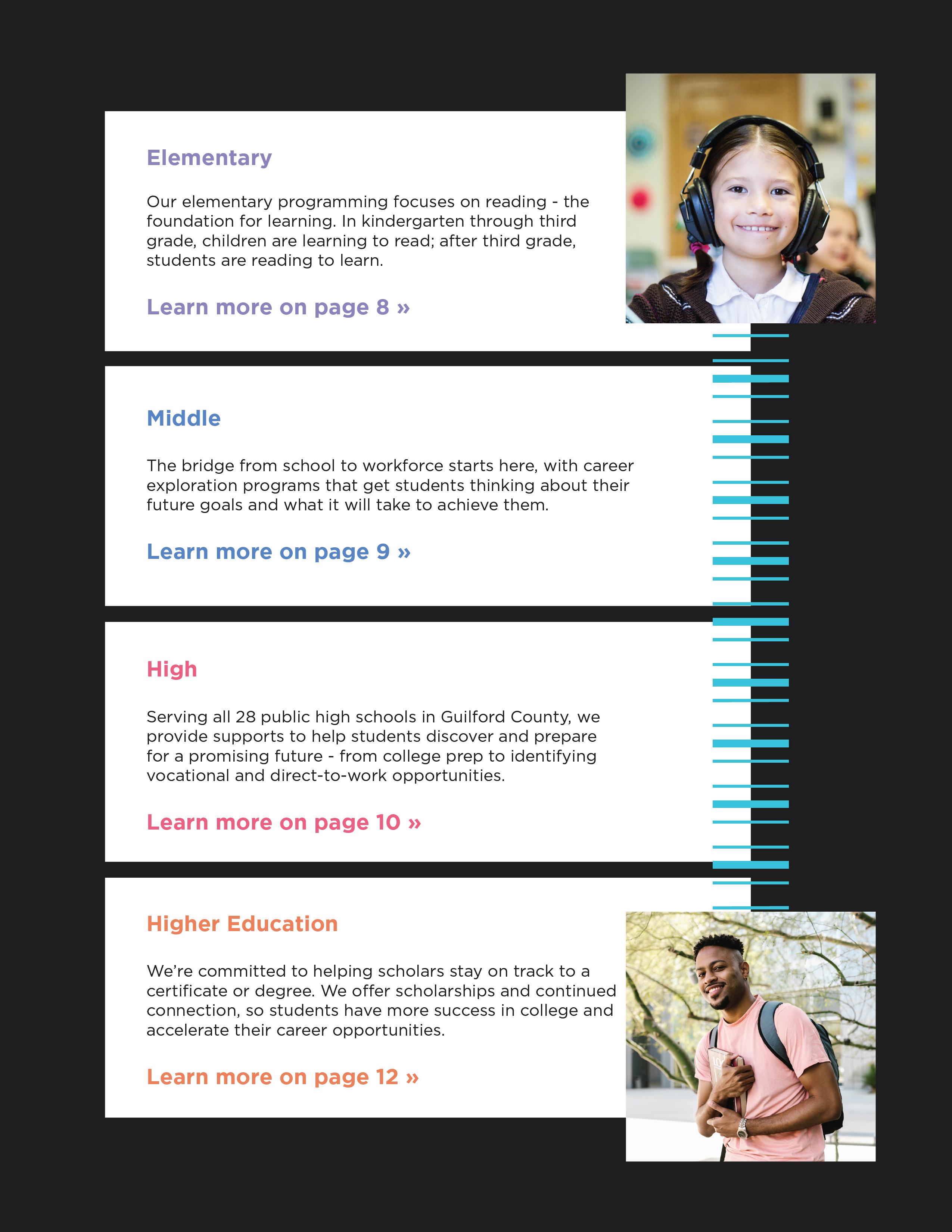 As an organization that currently provides support for students from classroom to career, shift_ed will: Lead in providing student support, convening organizations that serve students and stewarding data to facilitate awareness and impact Partner strategically with key education entities such as Guilford County Schools; Ready for School, Ready for Life; postsecondary institutions; and economic development efforts.