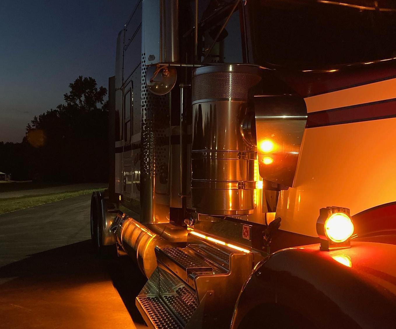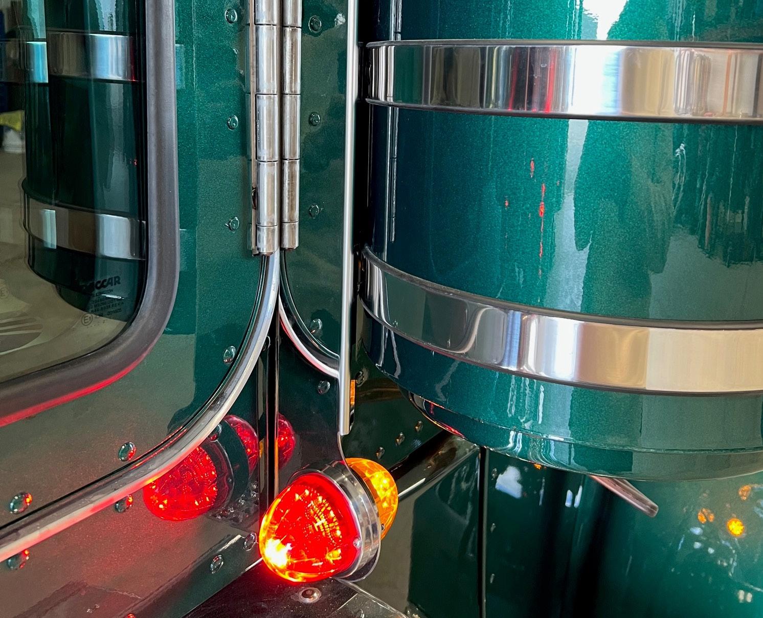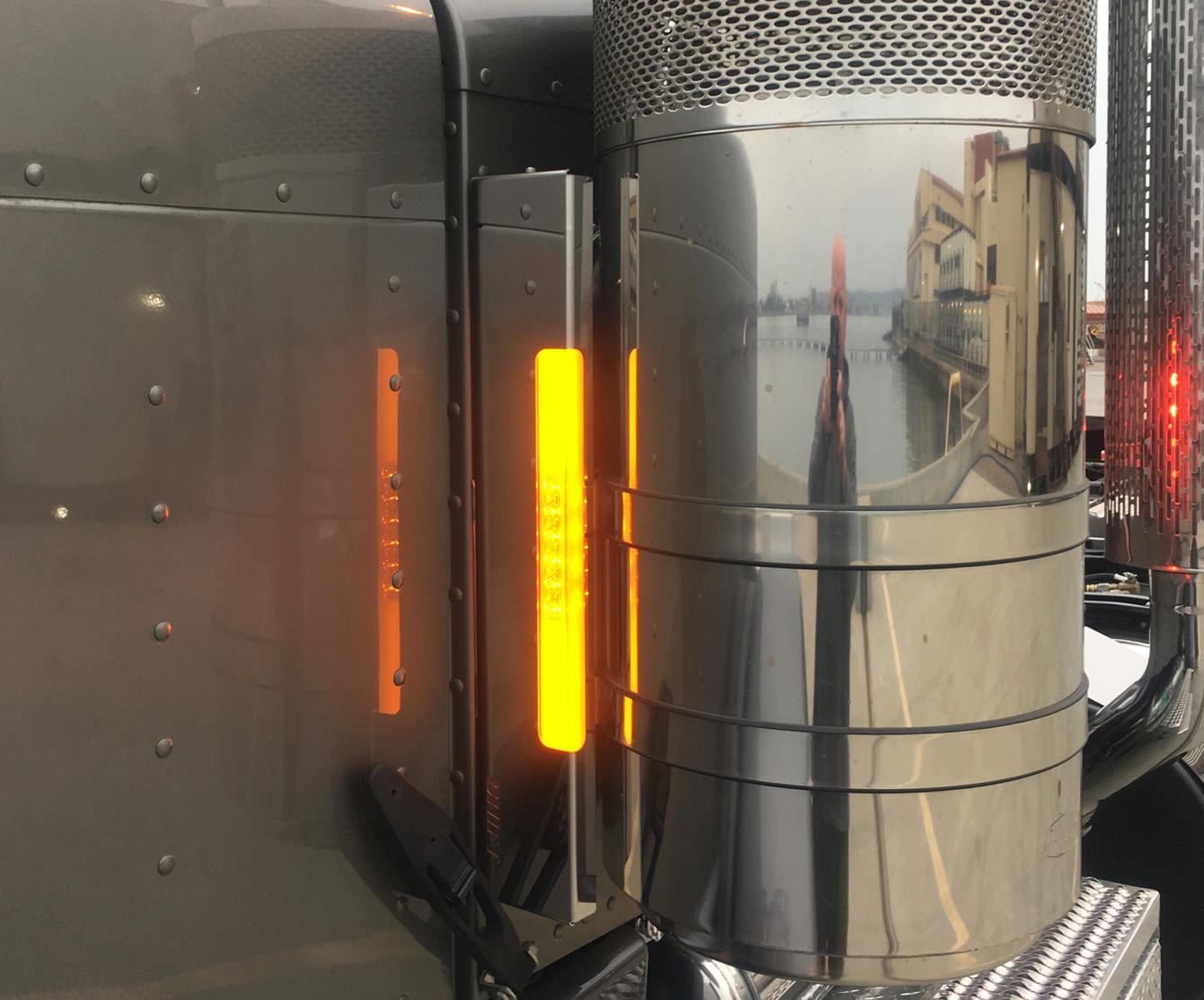 Our much anticipated Rear Kenworth Air Cleaner Bar has arrived. A one-piece design that offers a single watermelon or double-face watermelon LEDs that mounts right underneath the door hinges for enough clearance to install. An industry-first. Made of 16 ga. stainless steel.