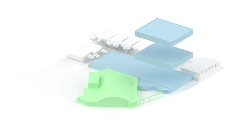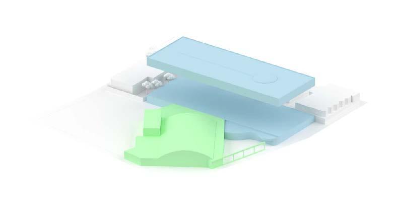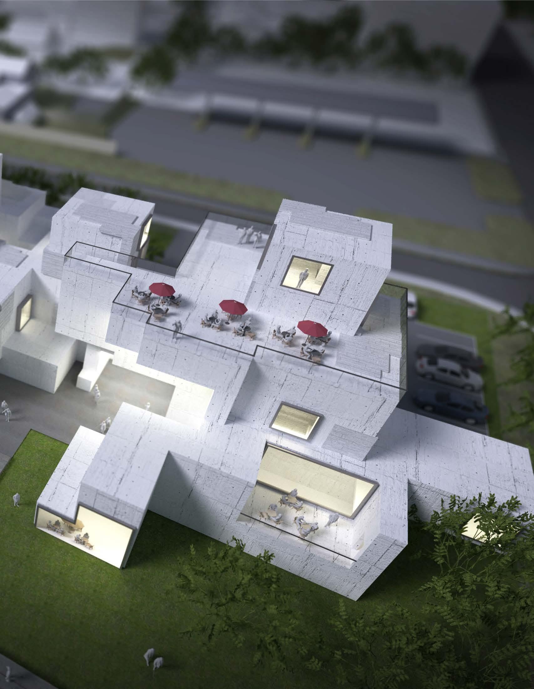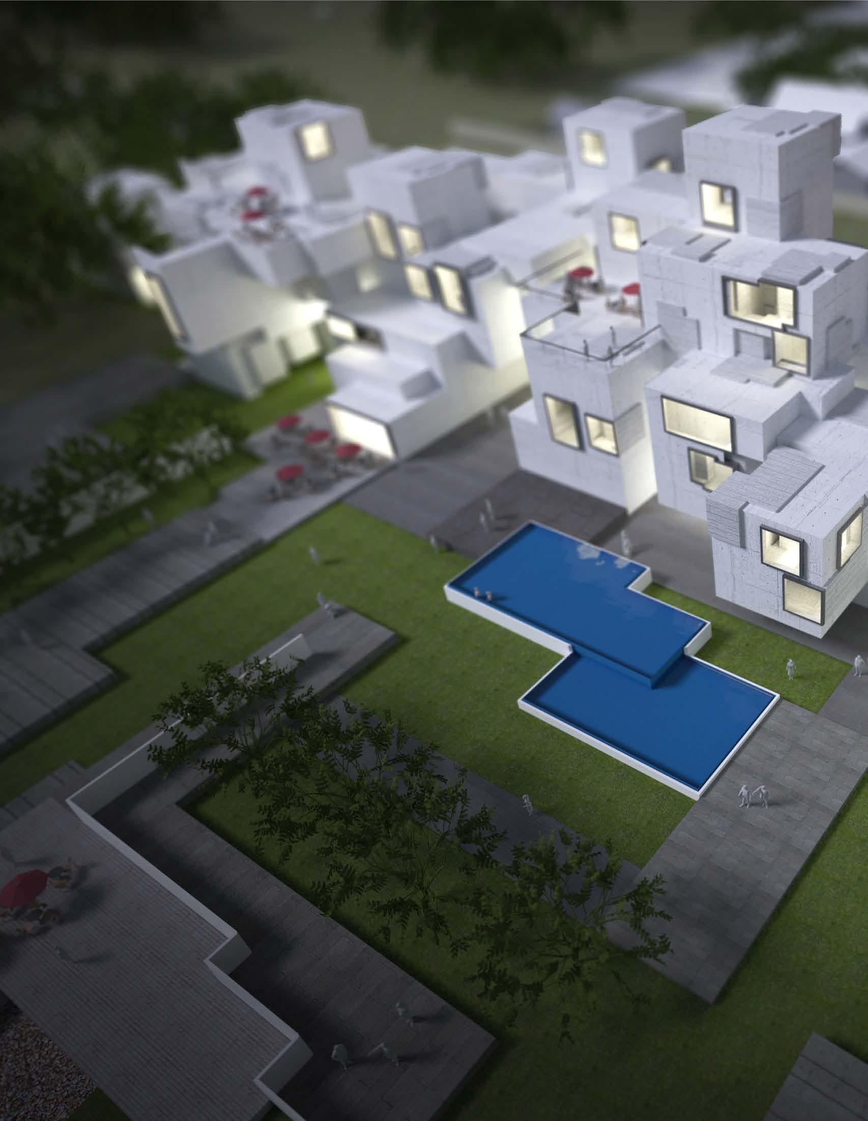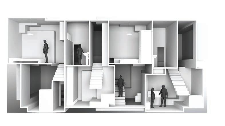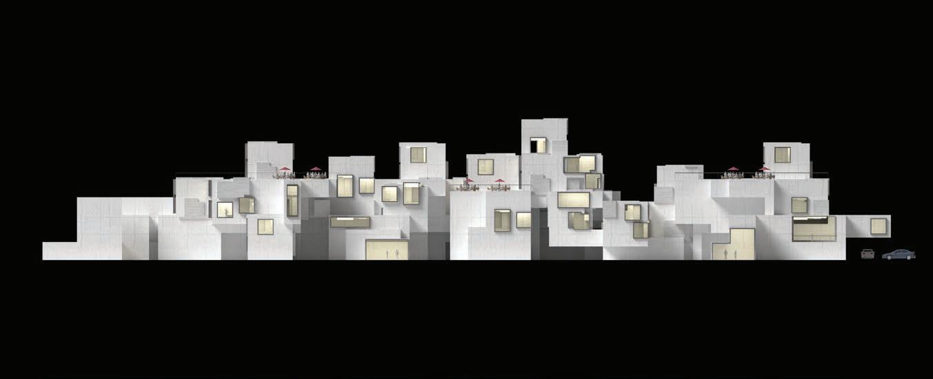 In this studio, my partner and I worked in pairs to develop an 80-unit housing complex on a riverside site in Cohoes NY. The goal of this project was to interrogate the nature of unitized housing, and how to create a sense of community between residents. To accomplish this, my partner and I developed a system of interlocking multi-story units that connect to form the overall structure of the building. The units create a varied exterior facade condition, and sit atop the lower level shopping center, parking, and indoor public spaces. The appartments utilize a skip-stop scheme to minimize the overall circulation space within the building while creating dynamic interior spaces which emphasize the interconnectedness of the units.