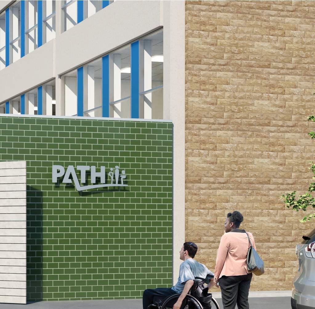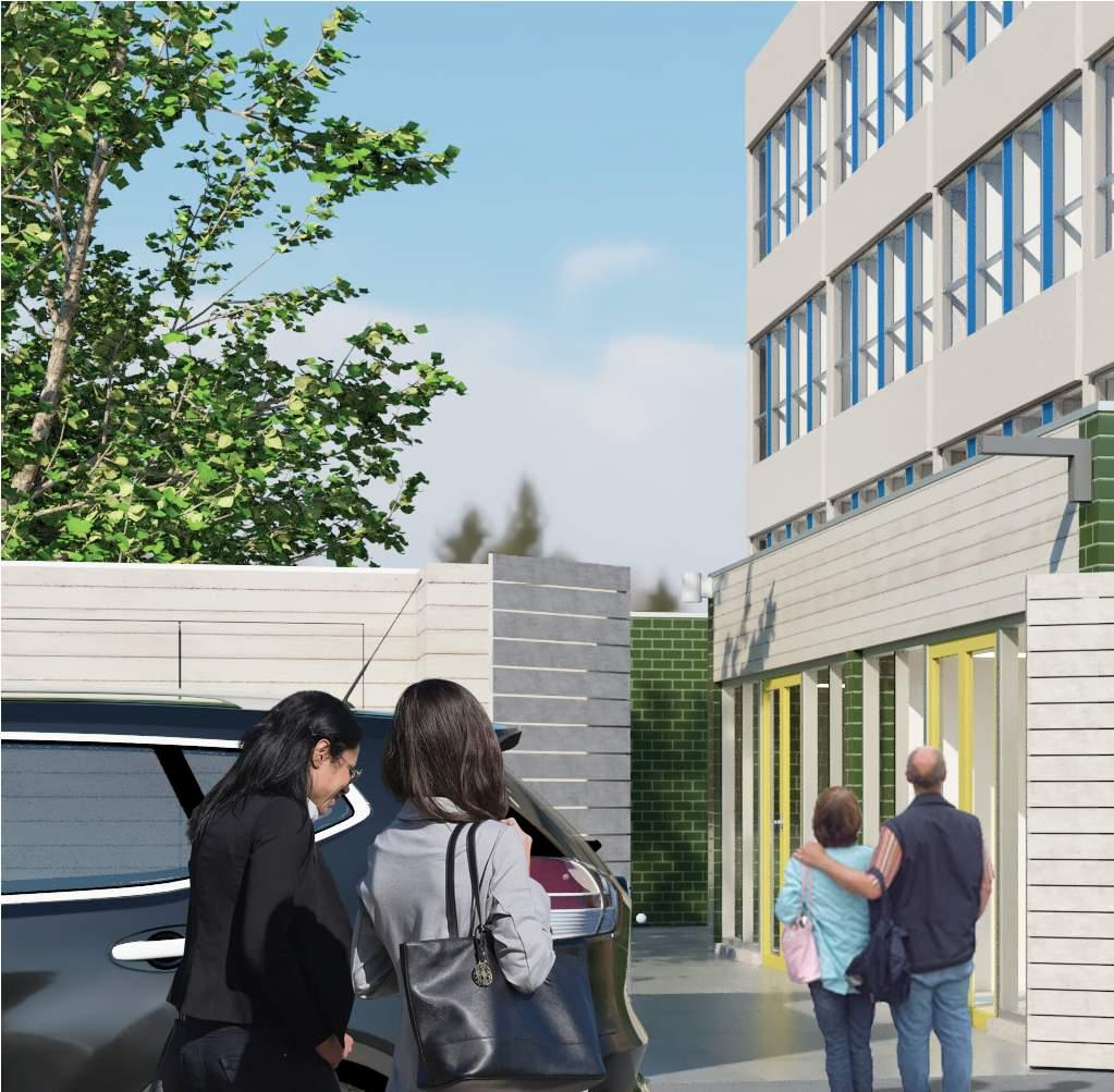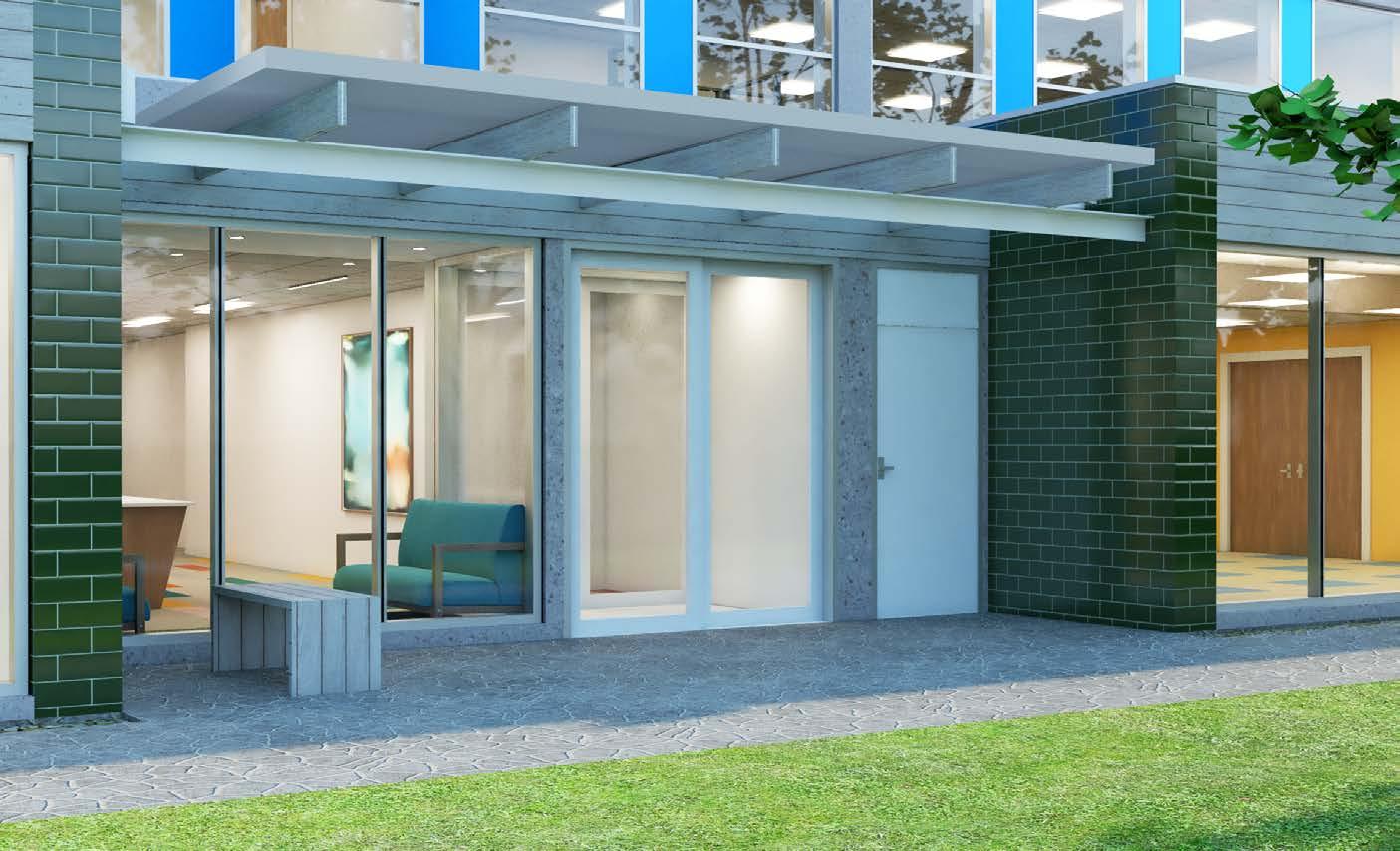 As part of the renovation, the entry sequence was changed to enter from the rear garden which was more accessible from the parking lot and provided shelter from the noise of Castor Avenue. This informed the site design to provide new plantings to de-emphasize the former entrance while creating a pathway connecting the sidewalk and parking lot to the garden. The activity rooms on the 1st and 2nd floors were oriented to maximize window area facing the garden, with direct access on the 1st floor rooms. The additions, which protrude 12’ from the existing structure are differentiated using a distinct material palette of glazed brick along the east and west facades and wood planks above the storefront system on the north facade.