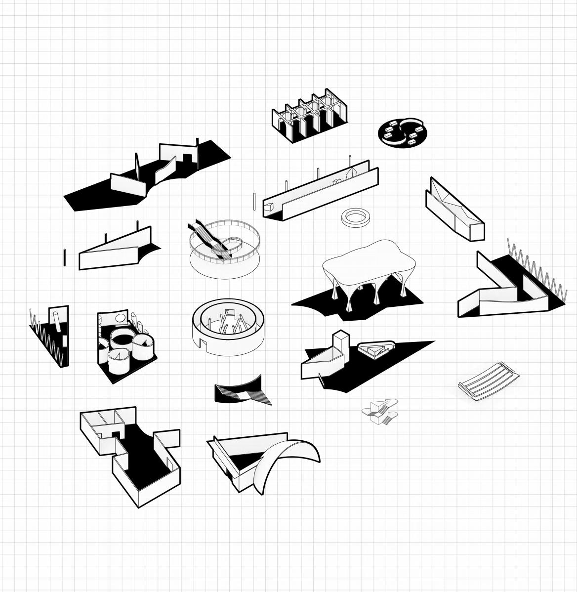 1The dislocation of the wall is used to create a zigzag shuttle tour path, which prolongs the duration of the space experience and increases the interest.