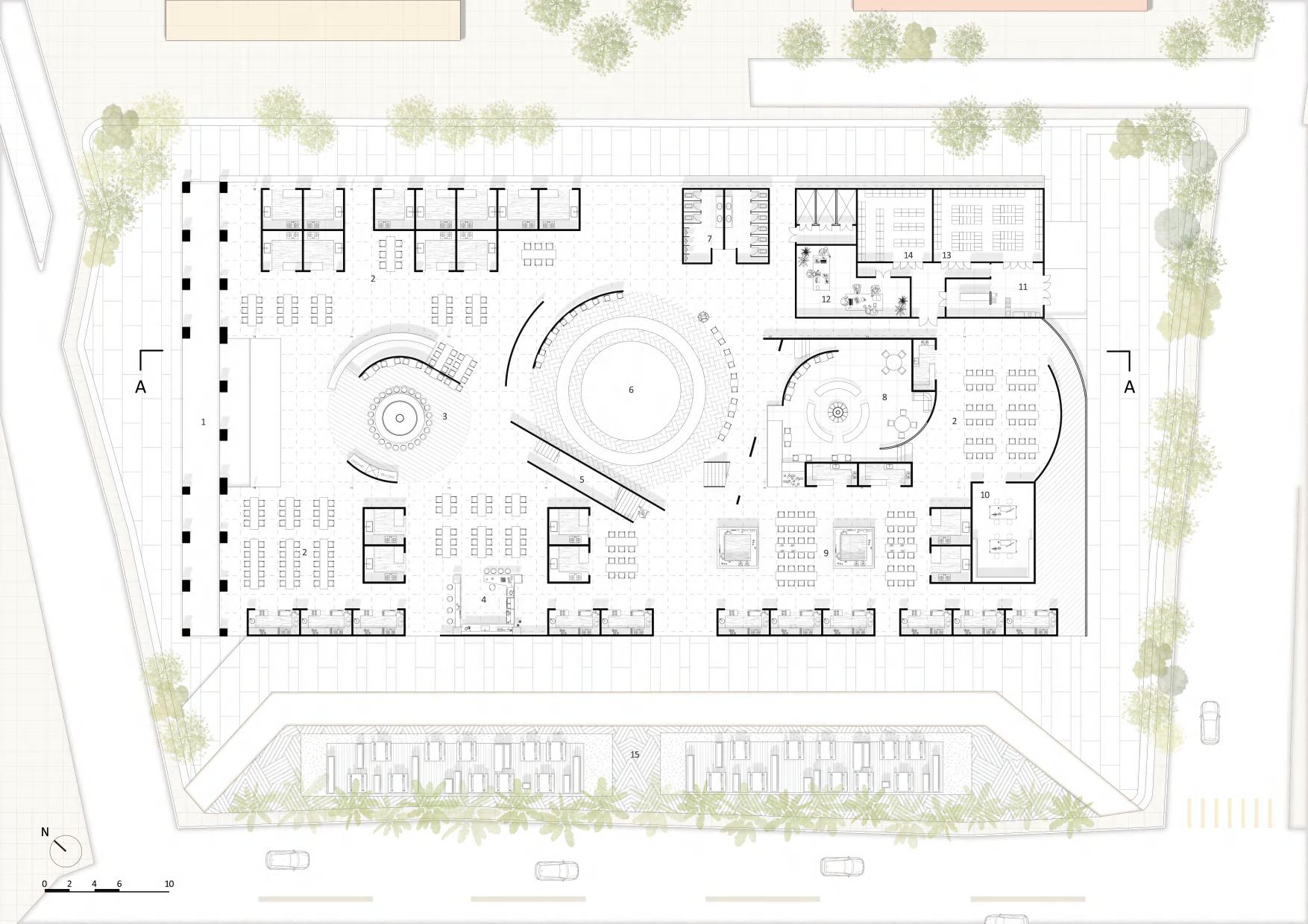 Open layout, community-like design, incorporating natural light, greenery, and open spaces.