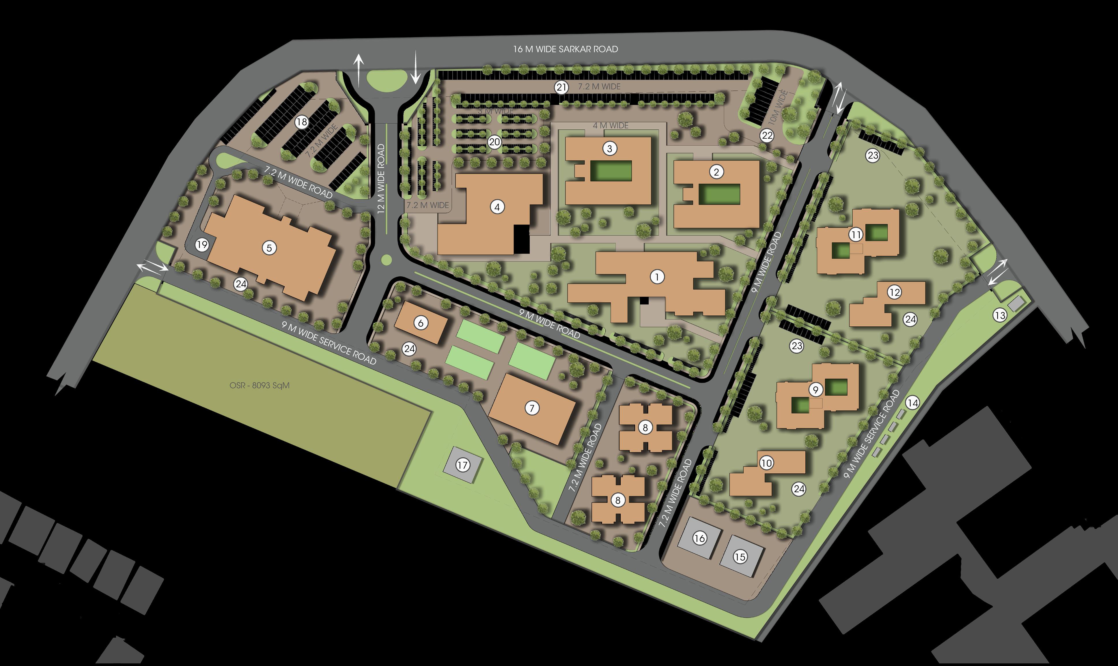 The academic zone is classified into UG block - architecture, UG block - planning and PG block with labs and library building close to each UG & PG block. The residential zone is further classified into boys hostel, girls hostel & staff quarters