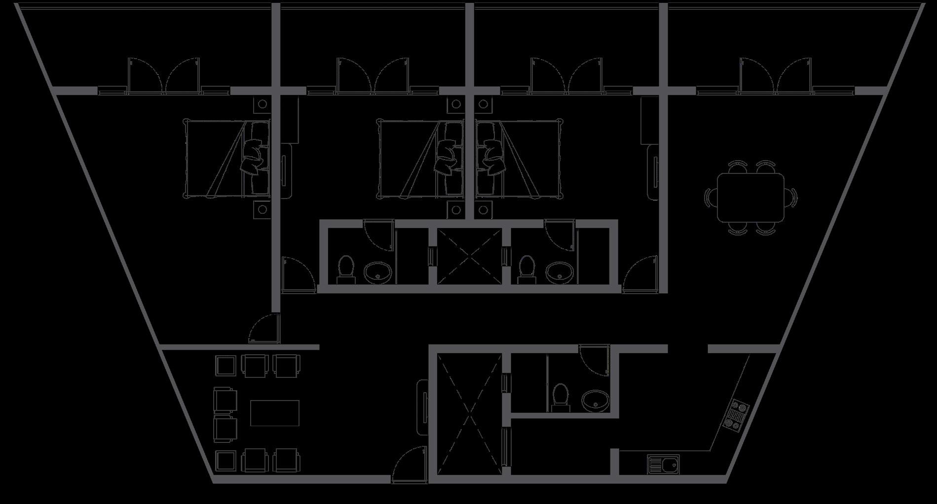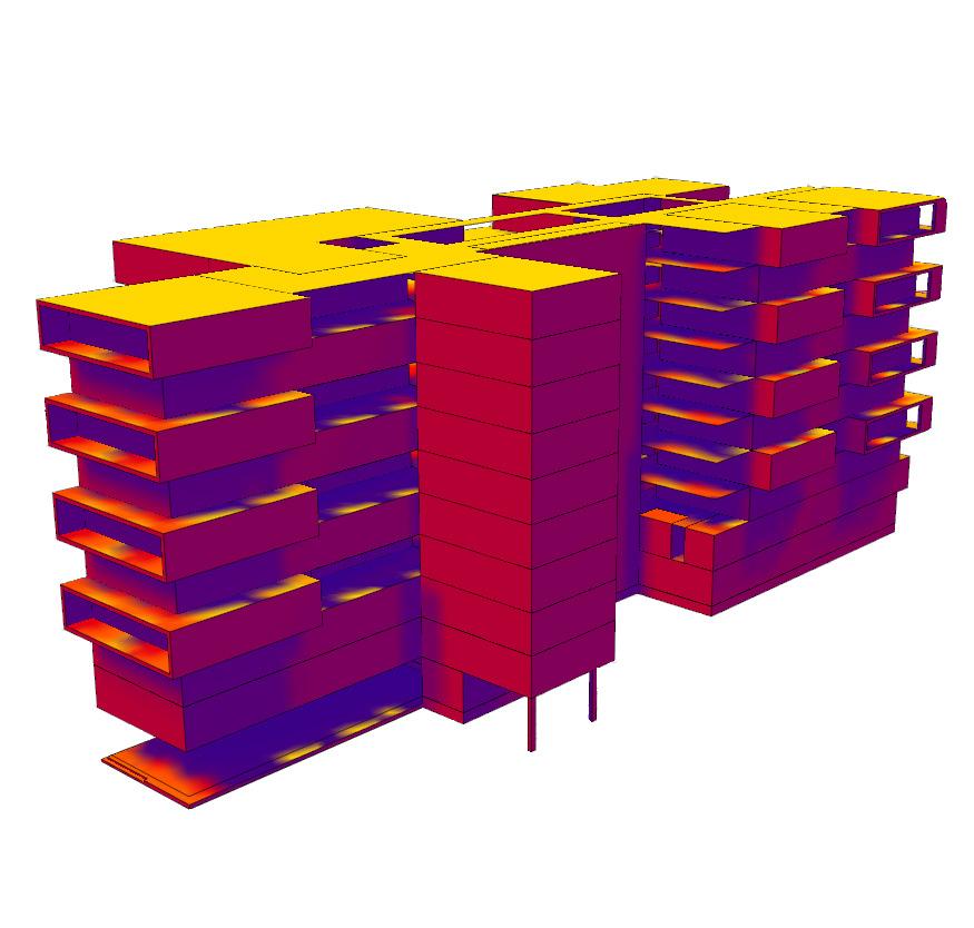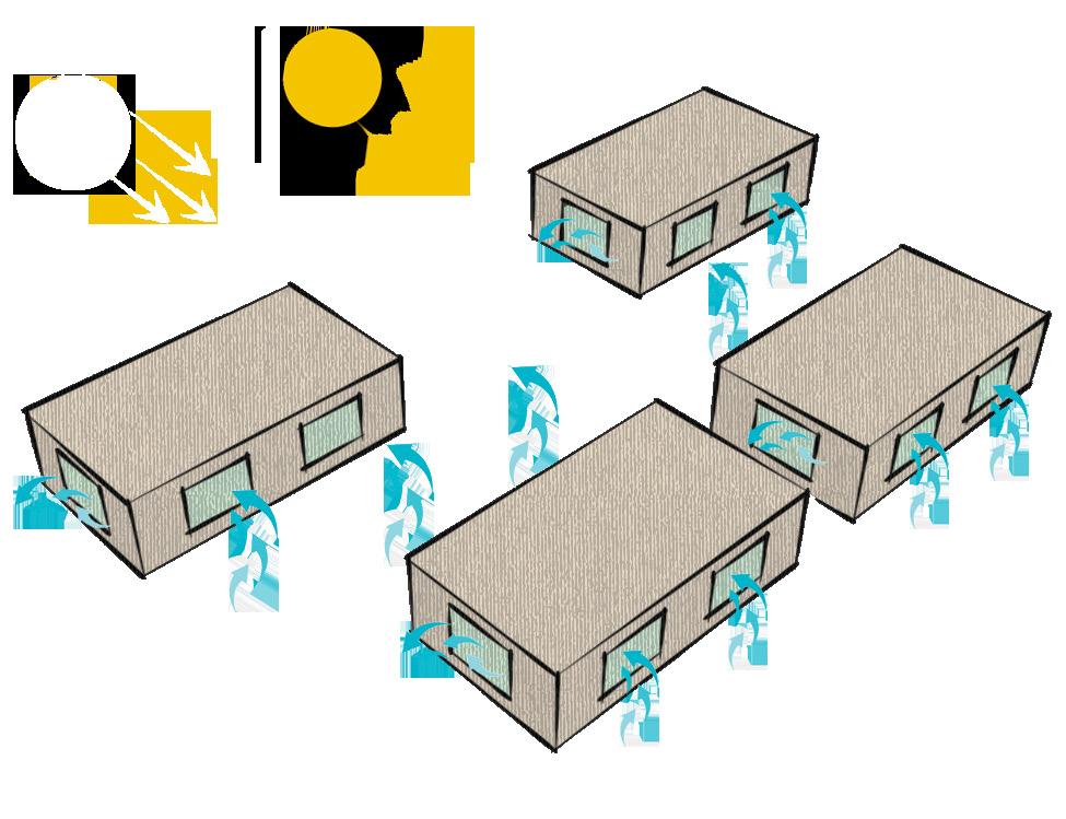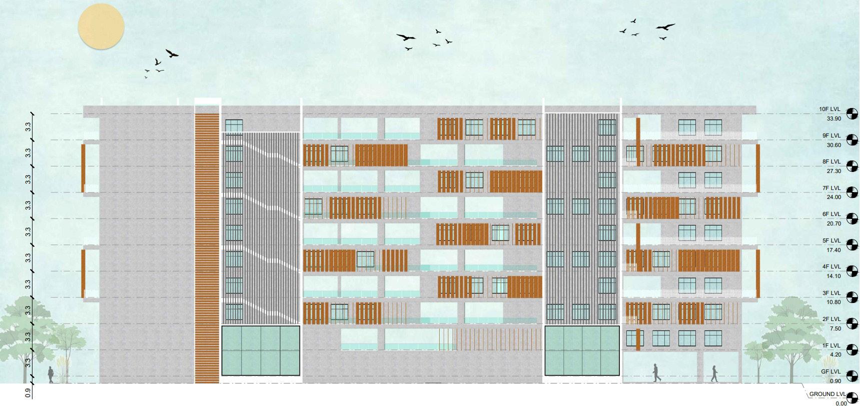 The surface area on the East and West facade are reduced by positioning the shorter side of the units on those orientation. Further, to cut off the radiation entering into the habitable spaces, non - habitable spaces such as toilets are located on those orientations.