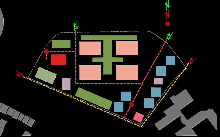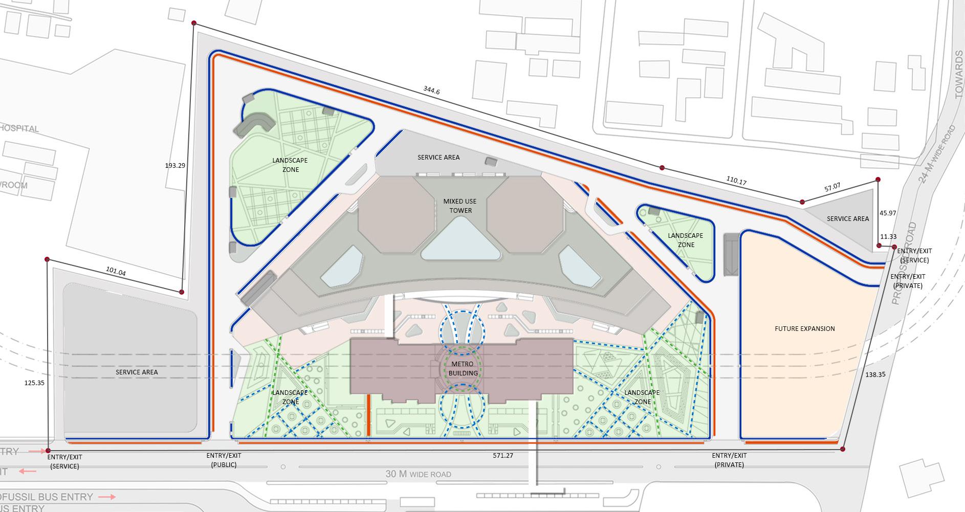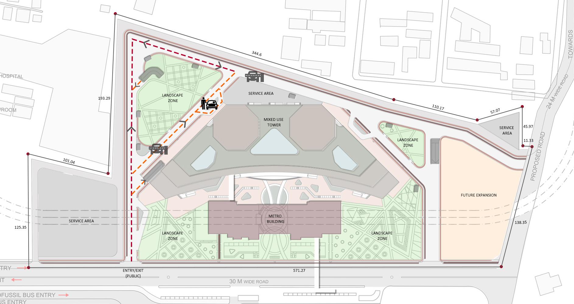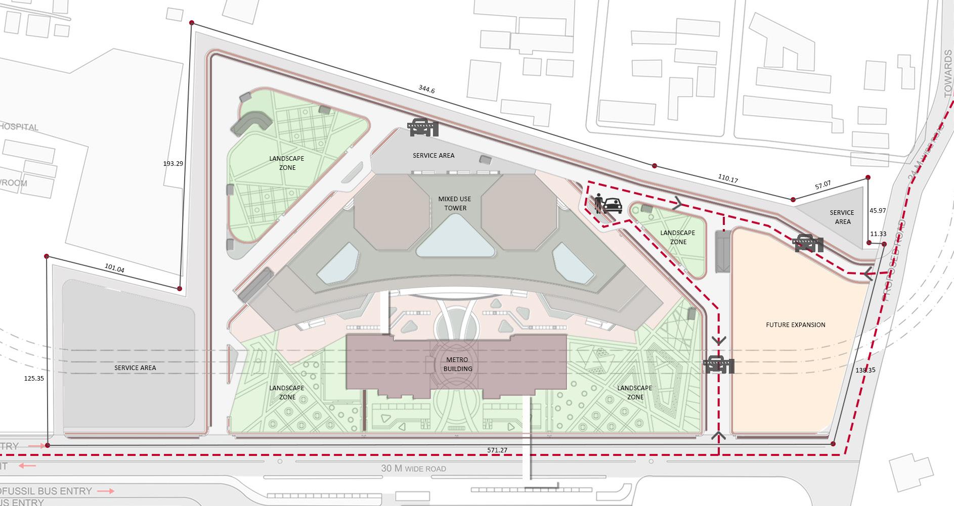 Multiple entry points to divert the movement of crowd. Security check points inside the site to restrict the entry of residential and academic users into the service zone. Continuous road is ensured for the movement of fire engine.