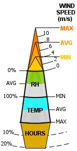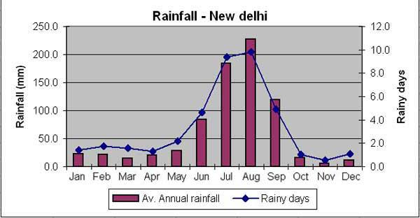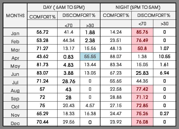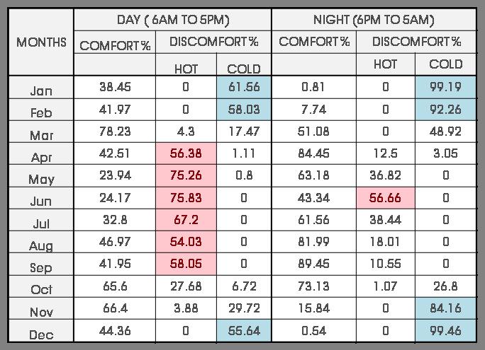 From the table 1 (temperature), it is observed that March and october are the months which are found to be comfortable throughtout the day. During day time, the hot discomfort is experienced more and it is noticed to happen from April till September. The cold discomfort is observed only in the month of January, February and December. During night time, cold discomfort is noticed to be high and it happens between November to February. The hot discomfort during night is found only in the month of June. Therefore, it can be concluded that June is found to be the hottest month and December is observed to be the coldest month. From the table 2 (relative humidity), it is found that high humidity (ie., above 70 %) prevails in Delhi for about 8 months in a year and it is noticed to happen during night time Low humidity is experienced only during the day time of April month. From the rainfall data, it is observed that it slightly increases from the month June and peaks during August and reduces gradually in the rest of the months. The annual rainfall index is 1.3 (Sheltered).