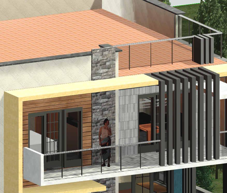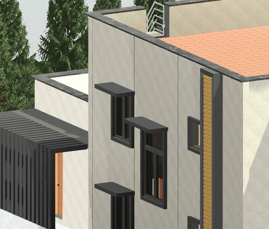 Thk Natural Stone Cladding with Rough Finish 4 1/2" Thk Duct Wall9631 Charcoal PlumN Coloured Asian Paints with Flat Finish Wooden Plank 6" X 6" Steel Hollow Section of 5mm Thickness Finished with Powdered Coating X105Lemon Ole Coloured Asian Paints with Createx Scratch Finish Ocean Pattern 4 1/2" Thk Parapet Wall8250 Winter Moon Asian Paints (Archi Concrete) with Pitted Finish 6" x 6" Steel Hollow Section of 5mm Thickness Finished with Powdered Coating Ventilator 9" Thk Boundary Wall8250 Winter Moon Asian Paints (Archi Concrete) with Pitted Finish Planter Box 9'3"