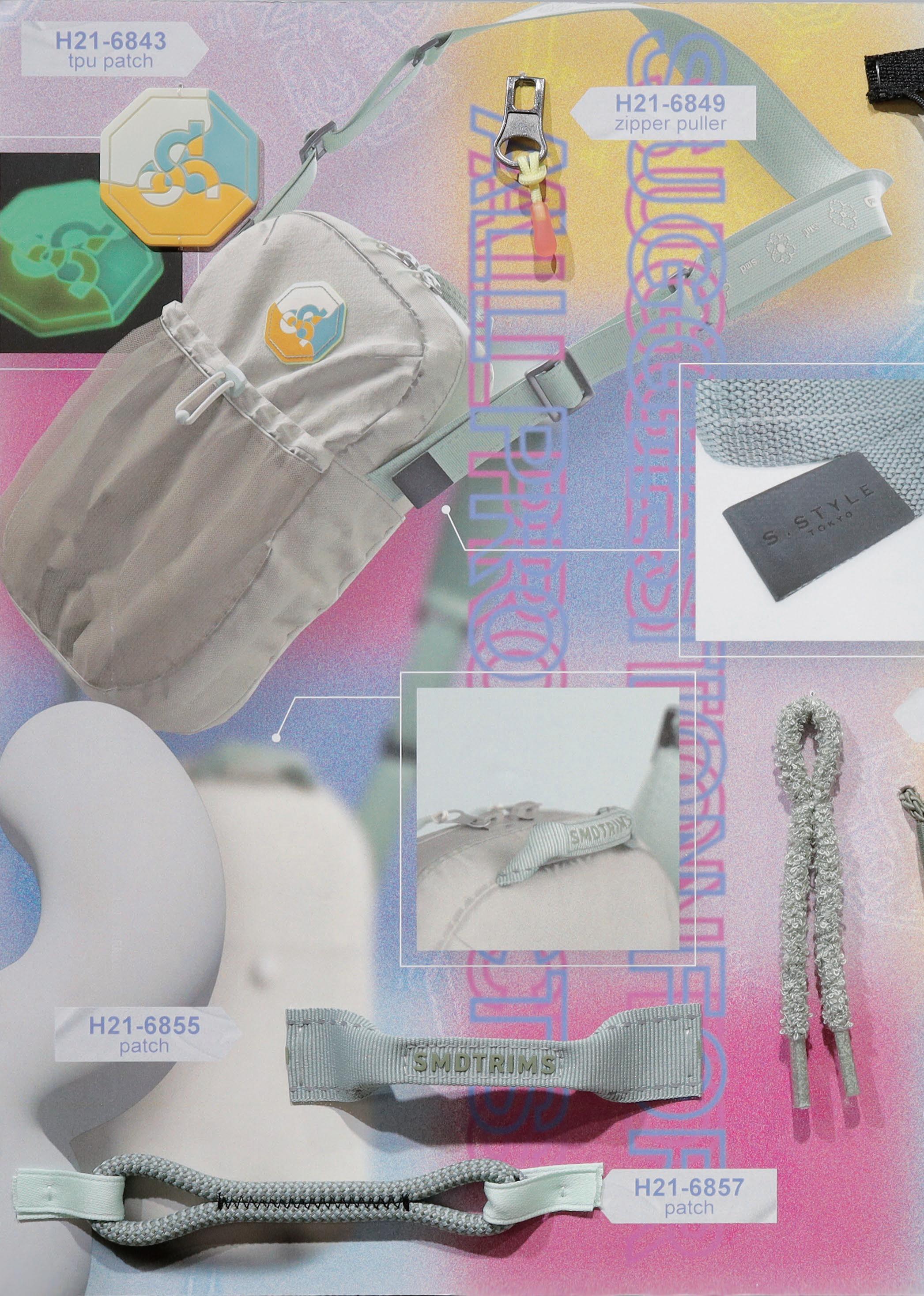 H22-8103 Elastic Tape H21-7904 Stretch tape S20H6016 Zipper Puller Moisture Wicking +jacquard debossed logo Debossed logo TPU +debossed logo S.STYLE 2022 DEBOSS AND EMBOSS S21J3110 Patch S20J3122 Patch Leather +debossed nubuck PU sheet +laser engraving DEBOSS TRIMS 20