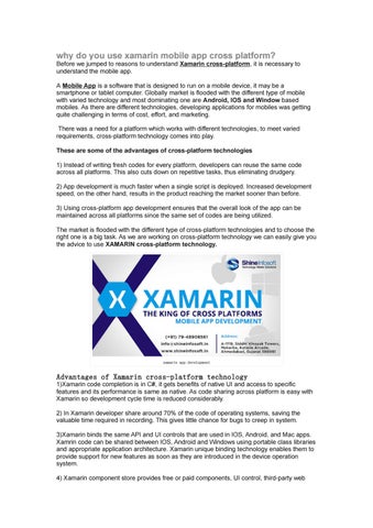 Advantages of Xamarin cross-platform technology 1)Xamarin code completion is in C#, it gets benefits of native UI and access to specific features and its performance is same as native. As code sharing across platform is easy with Xamarin so development cycle time is reduced considerably. 2) In Xamarin developer share around 70% of the code of operating systems, saving the valuable time required in recording. This gives little chance for bugs to creep in system. 3)Xamarin binds the same API and UI controls that are used in IOS, Android, and Mac apps. Xamrin code can be shared between IOS, Android and Windows using portable class libraries and appropriate application architecture. Xamarin unique binding technology enables them to provide support for new features as soon as they are introduced in the device operation system. 4) Xamarin component store provides free or paid components, UI control, third-party web