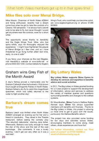 The opportunity arose thanks to Aerobility and the Eagle Wings Trust. Mike, who has spina bifida, says he thoroughly enjoyed the experience: ‘ I might have frightened the people of Menai Bridge as I flew over, and as I have threatened to go flying further afield next time, really, no one is safe!’’ If you fancy your chances as the next Biggles, visit Aerobility’s website at www.bdfa.net or phone 0303 303 1230. Contact details for Eagle’s
