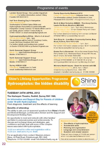 Family Opportunity Weekend 2012 Friday 16 –Sunday18 March Britannia Hotel, Leeds For information contact: Denise Richards or Joan Pheasant 0113 255 6767 office@shinecharity.org.uk North & West Yorkshire ASBAH - Thornbury Centre, Leeds Old Road, Bradford, BD3 8JX 18 Feb and 31March 1pm - 5pm Adult Workshops On Saturday 21 April 12-4pm Easter Party with disco Drop in - first friday in every month For further details and booking form contact Jo Baxter 07932621809 or jo.baxter2@gmail.com York Drop-In - Low Moor Community Centre, Bray Road, Fulford, York YO10 4JG 2nd Wednesday in each Month – 1pm- 3pm For further information please contact: Tel 0113 2556767 Email Sylvie.bailey@shinecharity.org.uk Easter Fun in Somerset - Shine Somerset Easter Party, Perry Street Club, Waterlake Road, Knapp Mill House, South Chard, Somerset TA20 2SU Saturday 7th April 2012 from 2- 5pm. Contact Tammy O’Dwyer 07593 830681 or 01460 66135 or email tammyodwyer@btinternet.com by Monday 2nd April Womens Health Issues - Event for women with SB Tuesday, February 21st, 2012, from 1.00pm Cheshire County Sports Club, CH2 1PR elizabeth.miers@shinecharity.org.uk 01490 450360