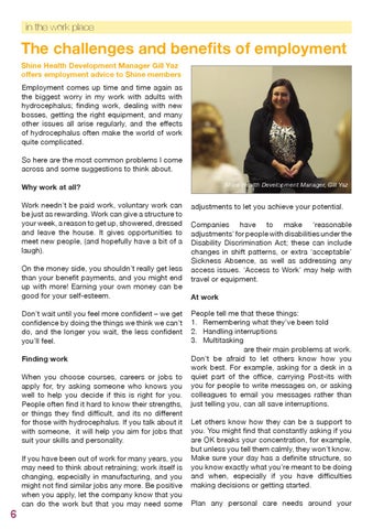 The challenges and benefits of employment Shine Health Development Manager Gill Yaz offers employment advice to Shine members Employment comes up time and time again as the biggest worry in my work with adults with hydrocephalus; finding work, dealing with new bosses, getting the right equipment, and many other issues all arise regularly, and the effects of hydrocephalus often make the world of work quite complicated. So here are the most common problems I come across and some suggestions to think about. Shine Health Development Manager, Gill Yaz