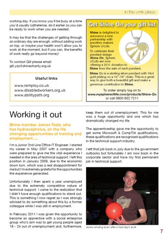 news in the work place working day. If you know you’ll be busy at a time you’d usually catheterise, do it earlier so you can be ready to work when you are needed. It may be that the challenges of getting through an ordinary day are enough, without adding work on top, or maybe your health won’t allow you to work at the moment, but if you can, the benefits of work really go beyond money! To contact Gill please email: gill.yaz@shinecharity.org.uk