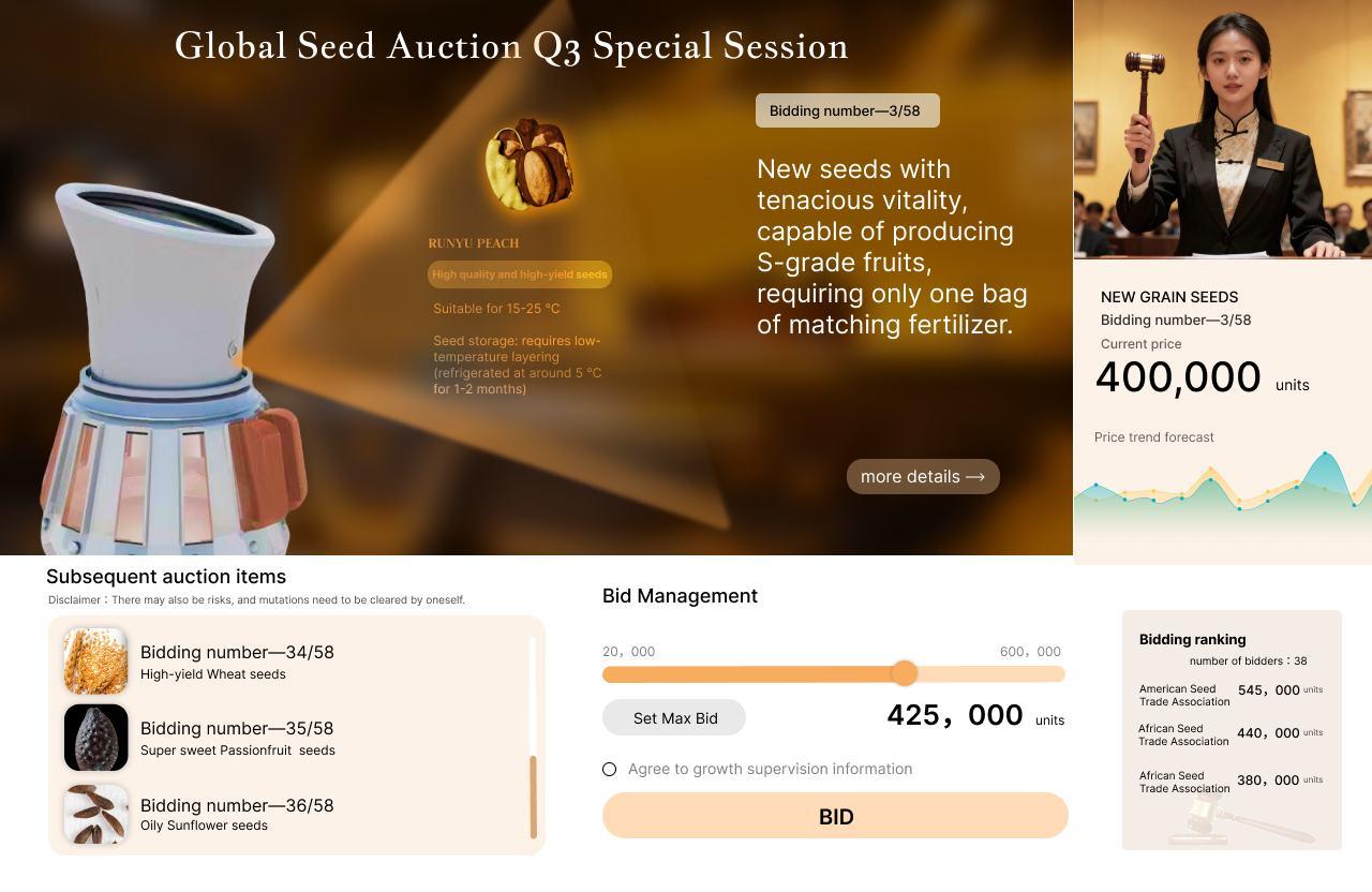 In a future where genetically modified crops have caused global ecological instability, natural seeds become the world’s most valuable strategic resource. The Germplasm Exchange Programme replaces traditional seed monopolies with a transparent, ecology-driven trading system regulated through digital monitoring and VR-based auctions. In this world, controlling seeds no longer means feeding people—it means determining who has the right to survive.