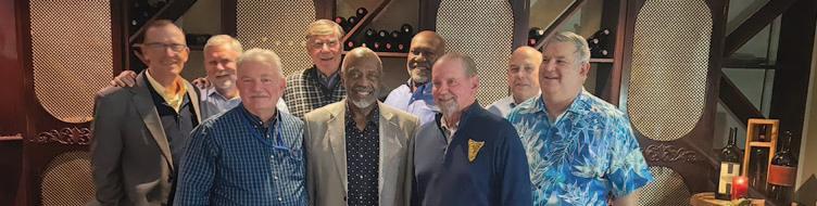 Jeff R. Webb ’95 (far left back row), RADM Julius S. Caesar ’77, USNR (Ret.) (second from left back row), and MajGen Charles F. Bolden ’68, USMC (Ret.) (centered back row) are joined by descendants of James H. Conyers at the ceremony honoring Mr. Conyer’s courage as the first Black midshipman to attend the Naval Academy, in his hometown of Charleston, SC, on 14 November 2022.