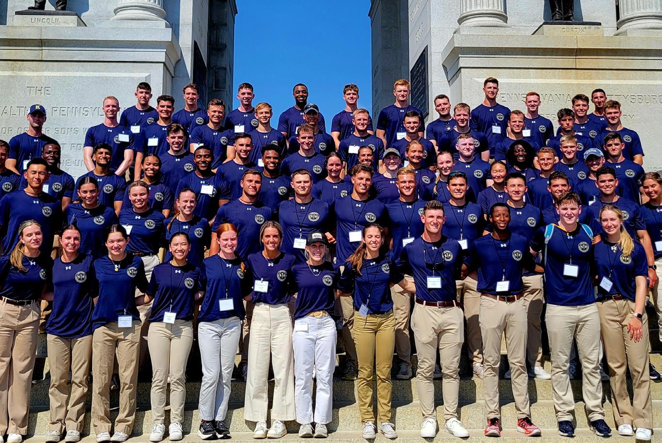 The Class of ’77 Gettysburg Leadership Encounter occurred for the Class of 2025 Brigade leaders over two days in June on the battlefield and at Gettysburg College. Varsity team captains and Brigade leadership learned about the responsibilities and challenges of command through lessons from the iconic U.S. Civil War battle. Midshipman leaders attended classes and break-out discussions covering the leadership tenets of loyalty, standards and action. The battlefield study enabled networking and team building through a cohesive network of peer support that facilitates critical professional relationships within the Brigade during the academic year. During the academic year, these leaders meet monthly before first period to discuss current leadership trends and challenges within the Brigade. In December each year, the second semester Brigade commanders spend one day in Gettysburg studying the same lessons.