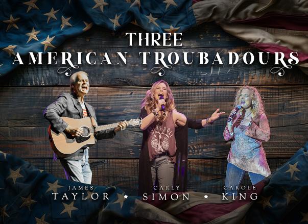“How Sweet It Is,” “Country Road,” “Shower The People,” “Anticipation,” “You’re So Vain,” “Mockingbird,” “I Feel the Earth Move,” “It’s Too Late,” and “You’ve Got A Friend.” These are just a few of the fantastic songs from Three American Troubadours -- a production that celebrates the lives and careers of six-time GRAMMY winner James Taylor, Rock & Roll Hall of Famer Carly Simon with 13 Top 40 Hits, and Carole King who wrote or co-wrote 118 Billboard Hot 100 Pop Hits. Three iconic American singer/ songwriters whose personal lives and careers have intertwined throughout the years, and whose memorable hit songs continue to offer ageless inspiration.