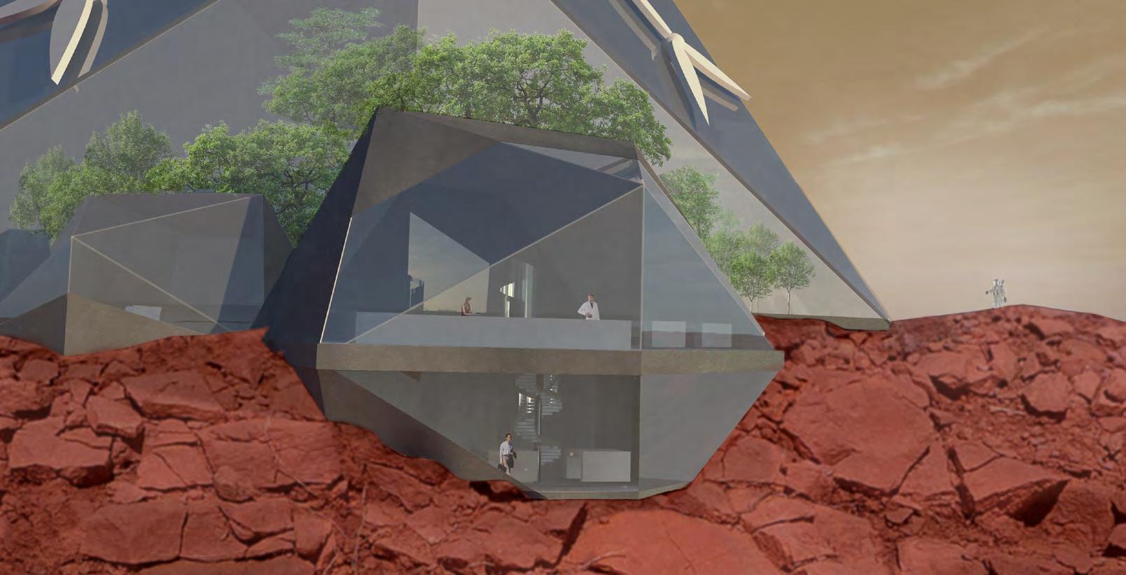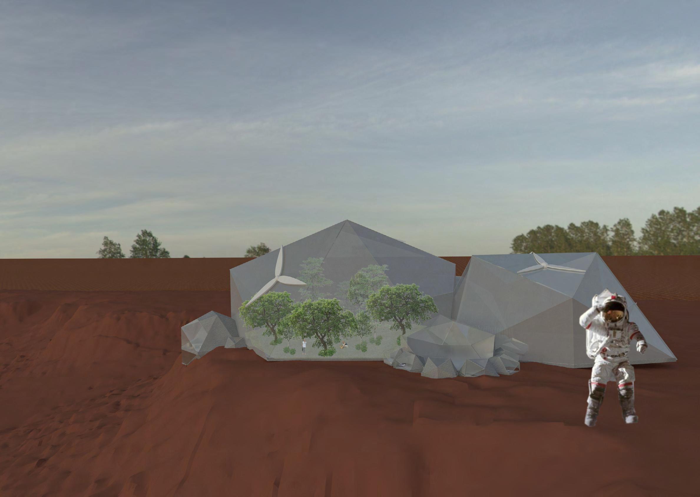 Eden on Mars a été conceptualisé pour le Marsecption 2018 Architecture Competition. Avec cette forme, on espère à reproduire les conditions et l’environnement qu’on trouve sur Terre. La fôret sert à séparer les différents espaces, ainsi qu’à créer un espace de loisirs. Eden on Mars a le potentiel d’habiter une génération autonome grâce à sa forme, l’énergie renouvelable et une ferme hydroponique avec sa propre réserve d’eau.