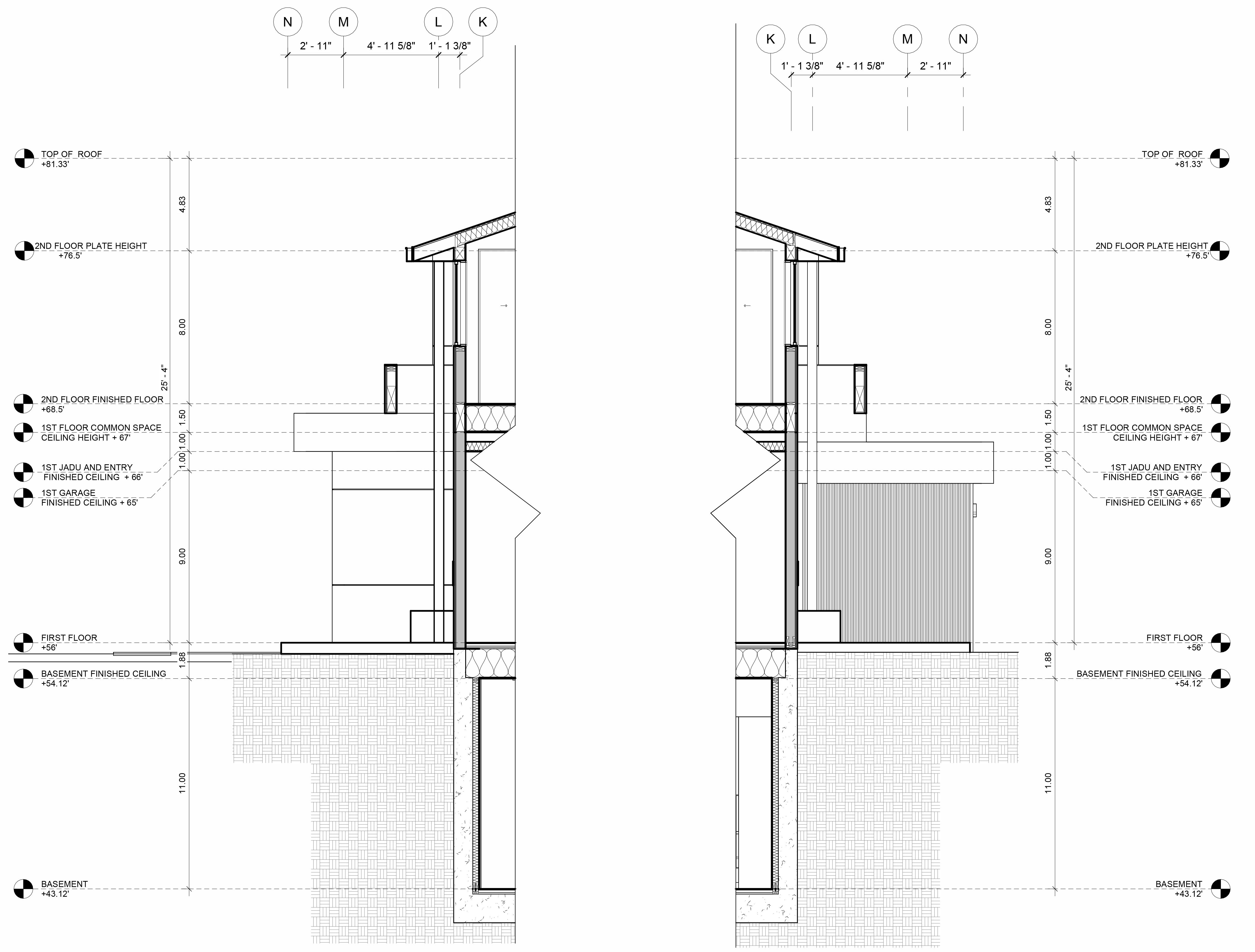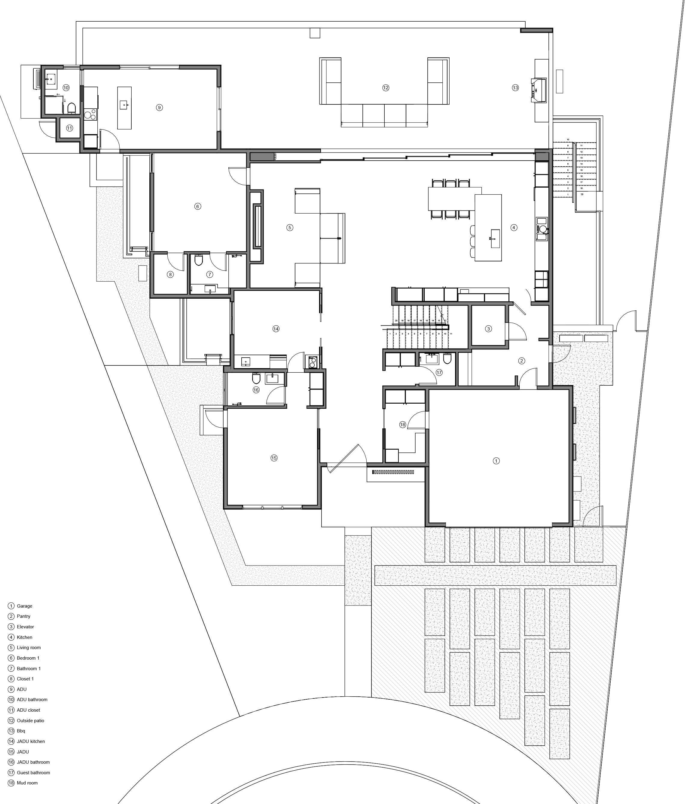 This two-story residential project, designed for a family in Palo Alto, features a basement, attached ADU, and JADU. The first floor includes an openconcept kitchen, living room, ADU, JADU, garage, and an outdoor patio with an exterior kitchen. The basement provides communal spaces, including a gym, wine cellar, and family room, while the second floor offers privacy with the bedrooms and bathrooms.