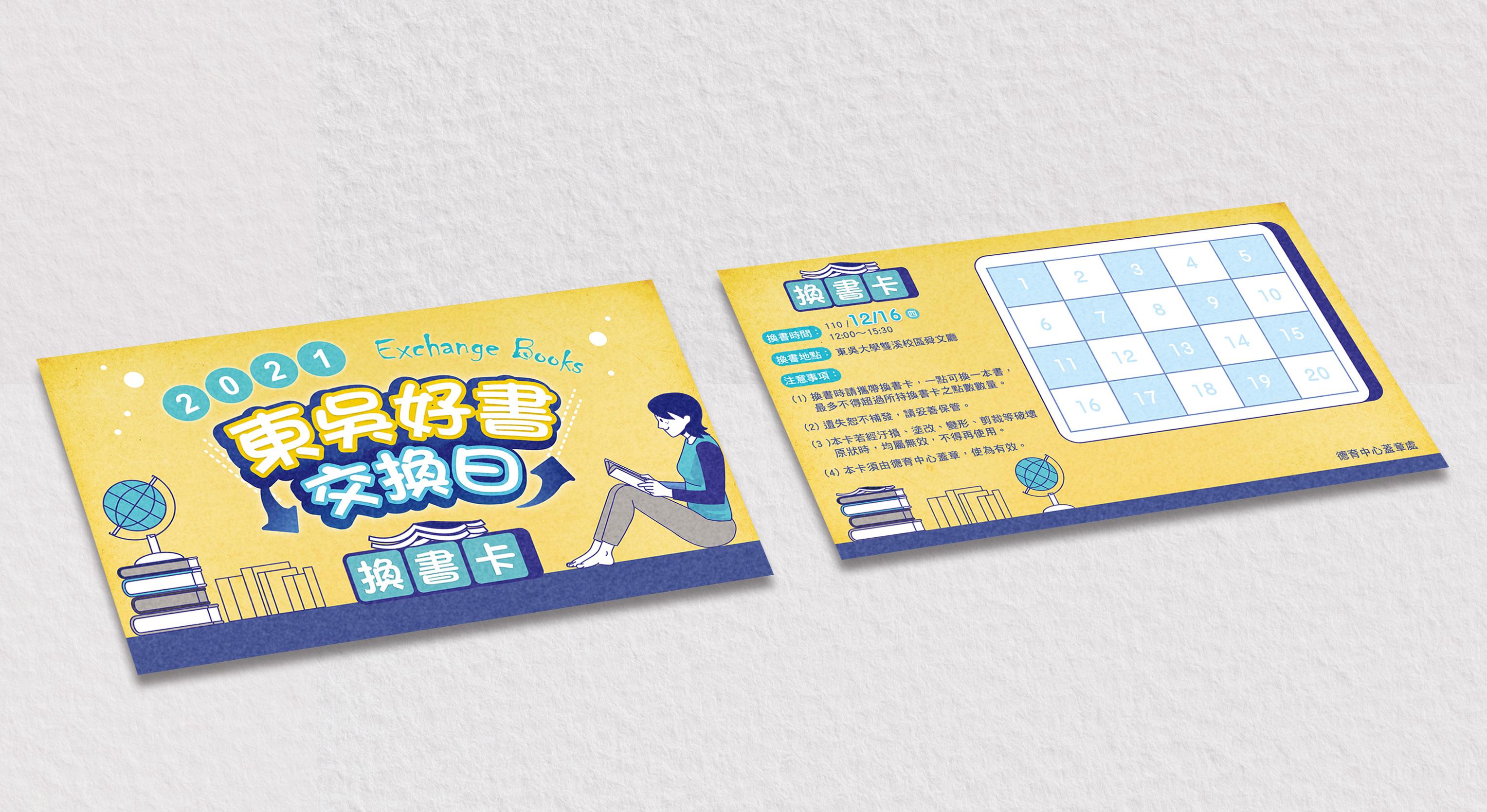 好書交換日是東吳大學每年提倡的活動, 提供一個媒介,讓閱讀過的書本不落於在 書櫃上生灰的命運,也能夠被他人所重新 拾起、運用;因此採用陽光活潑的插畫形 象,表現活動的意旨。