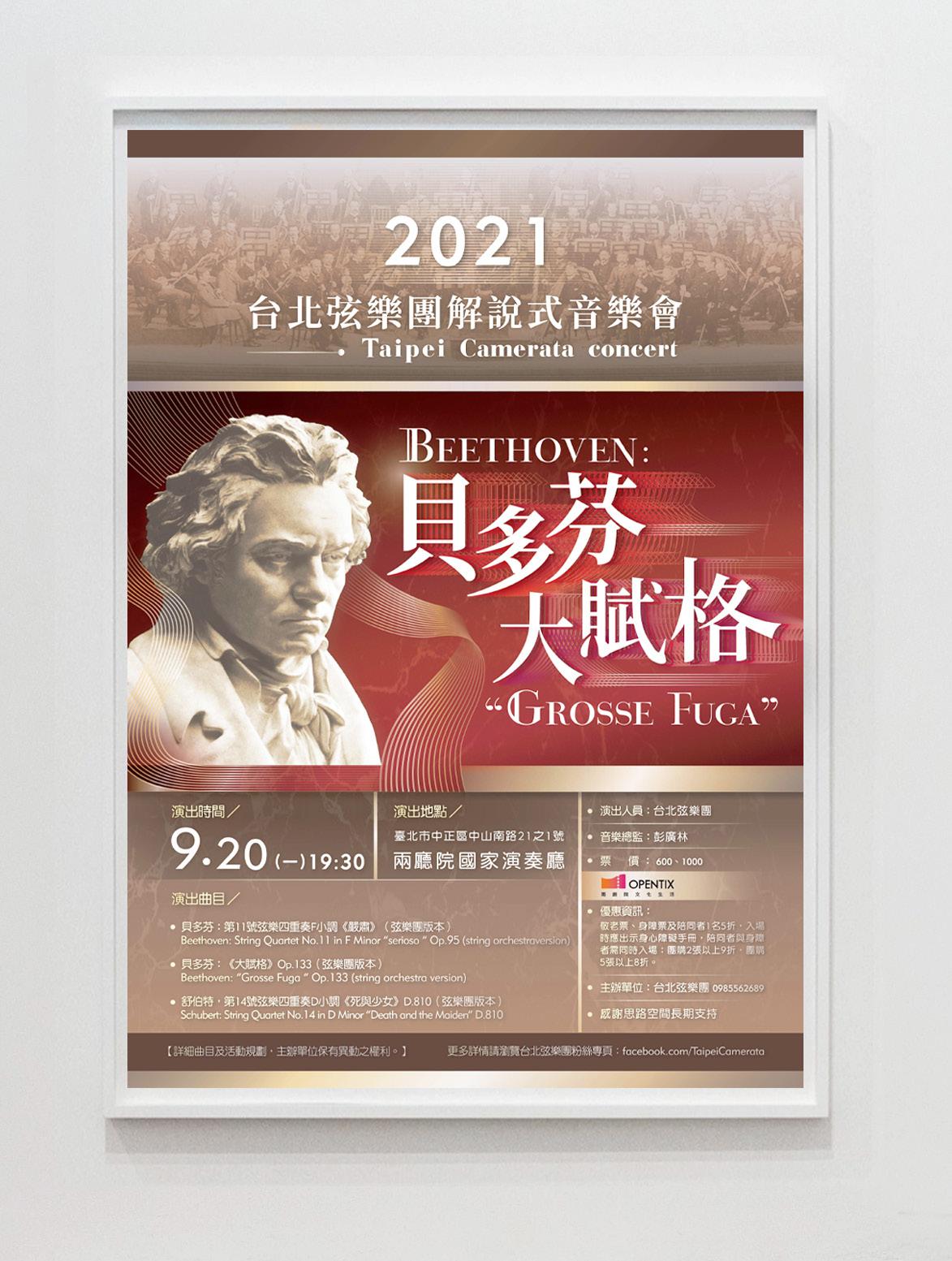 大賦格是貝多芬晚年前衛又瘋狂的告別作,直至當代才為世人所能夠解讀,即便如此,該作手稿 仍充滿修改痕跡,證明大師臨終前對此作之器重;因此,以貝多芬大理石雕像的肅重莊嚴為主形 象,標題文字的幻影呼應賦格所特有的「對位法」所設計,用古典的金色鑲住象徵瘋魔的紅色, 以悠揚的弦樂演繹著大師對創作的熱情以及超越時代的孤寂。