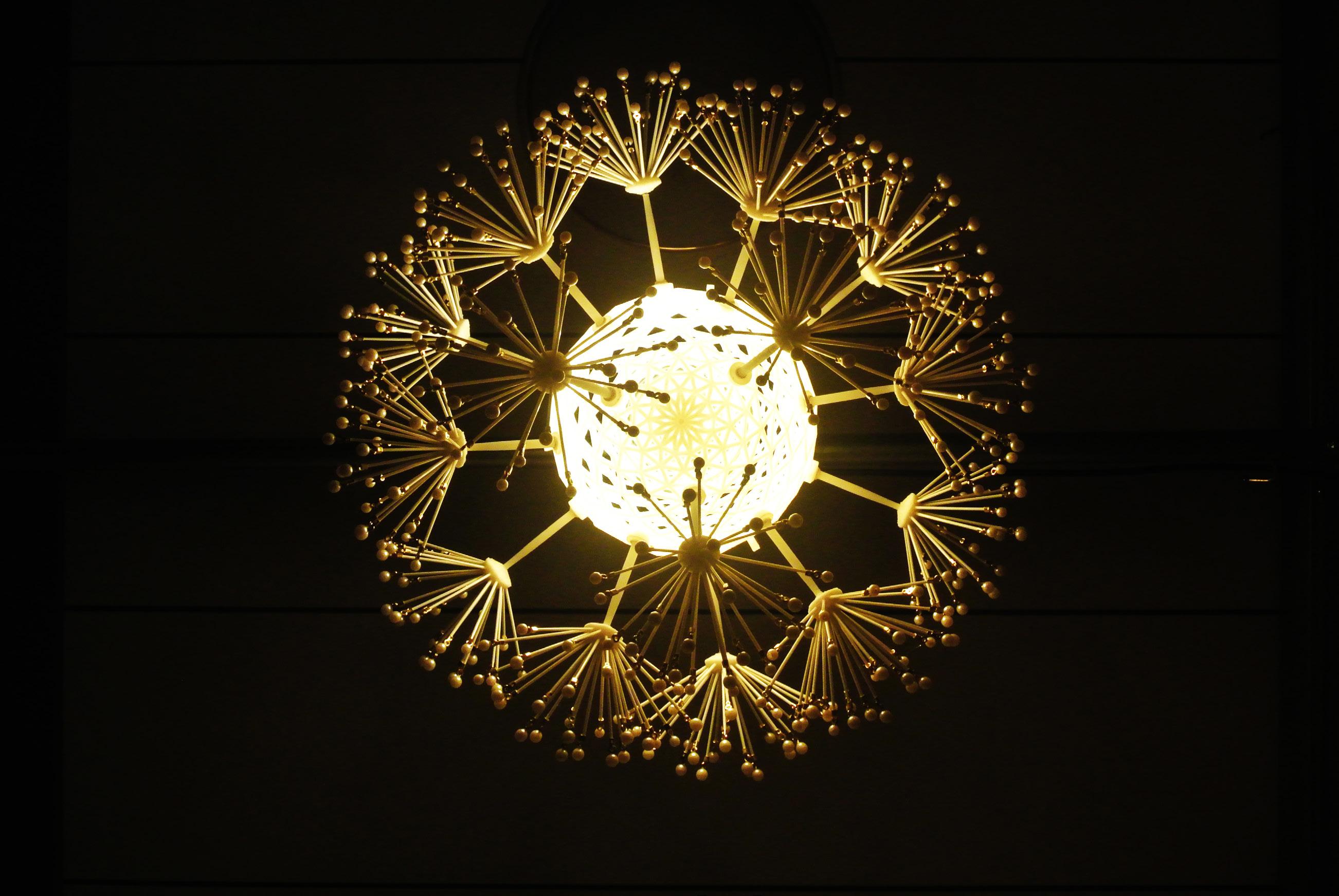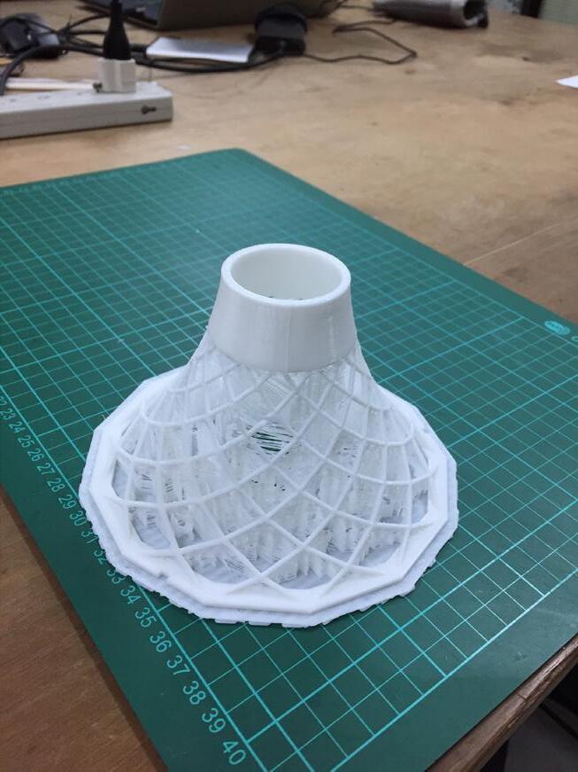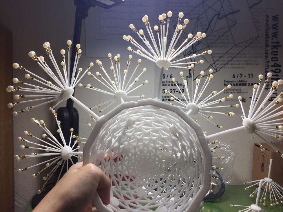 Fabrication: The complete lampshade is printed by a home 3D printer and the pieces include a cap, an upper and lower mesh, 15 components with 27 small holes, and 3 c-rings. As the maximum print area of the 3D printer is 20*20*20 (L*W*H cm), I must control the components’ size to ensure they are smaller than the printing area. Printing the mesh is the most challenging part; a suitable support density setting prevents the model from crumbling during the printing process. The thickness of the mesh is also adjusted to ensure it is printable. After printing, the support is removed carefully and the model is sanded to refine the surface. The rings are unlocked and an industrial light bulb is fitted inside the lampshade. The finished piece has a distinctive geometric pattern and looks like a golden flower shining in the dark.