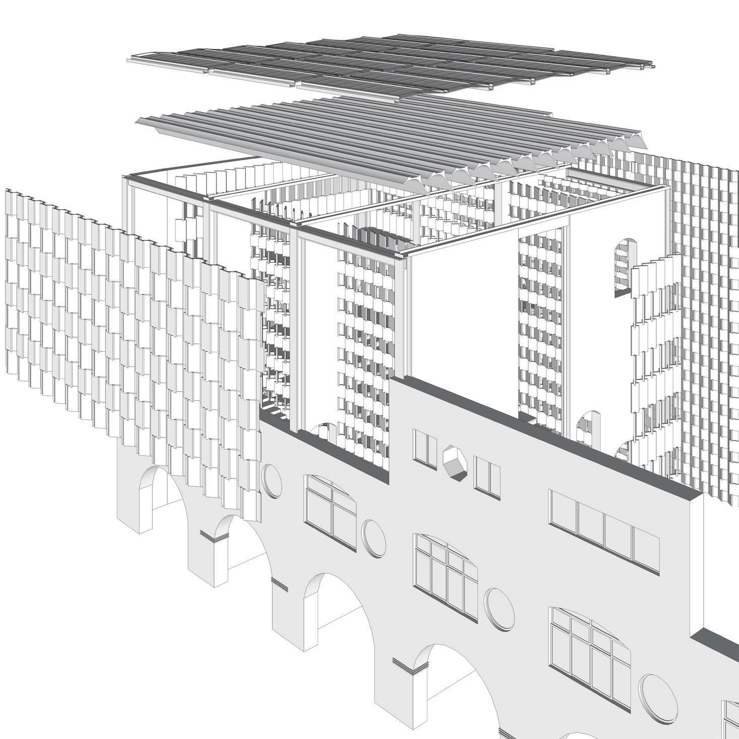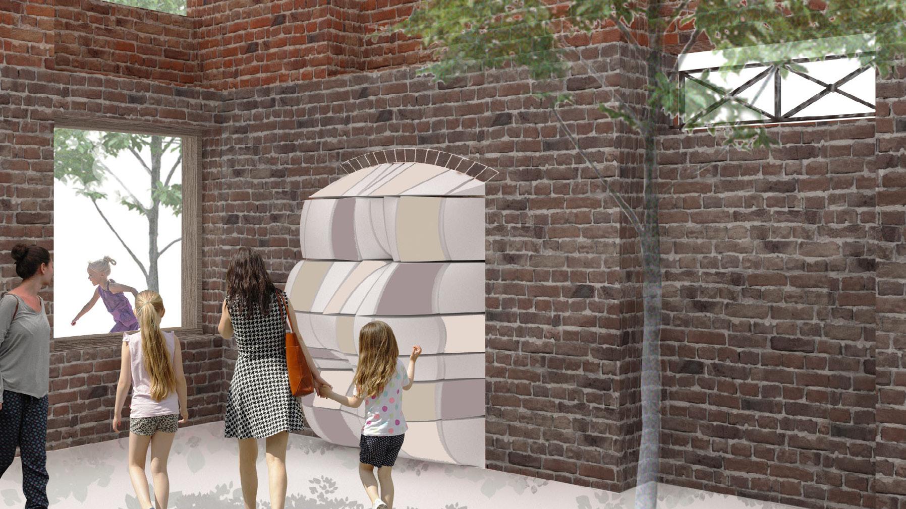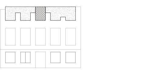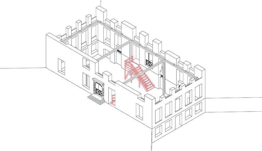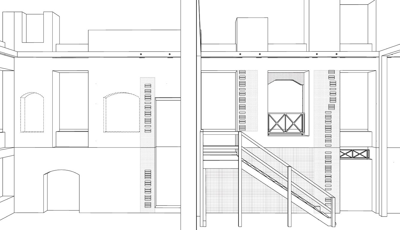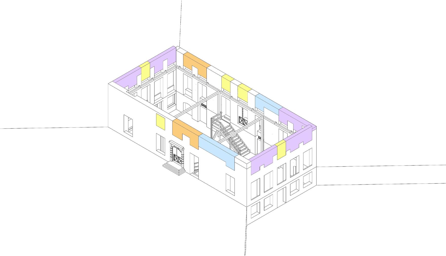 Design method: An investigation has revealed rich brick bonding patterns in the building. I propose to design a new block system which is embedded into the ruined structure. The original wooden windows, and recessed doors were completely burned out, and those parts have become hollow where the new block system will be filled in. The method of designing bricks will follow: