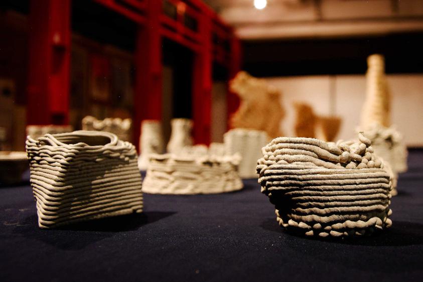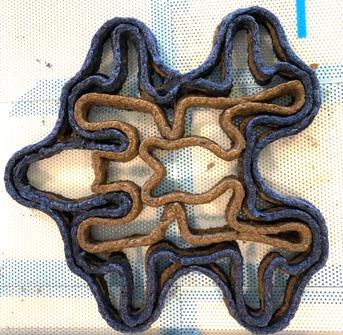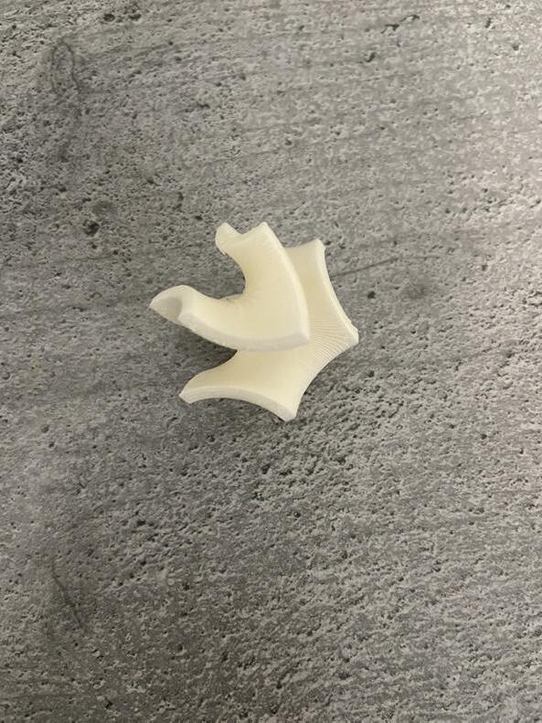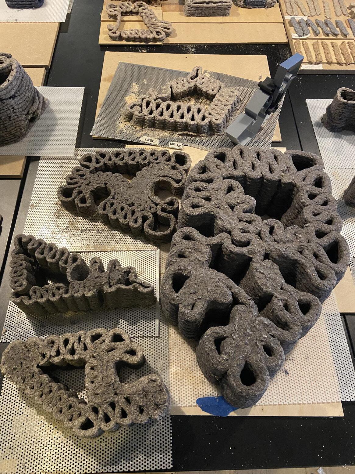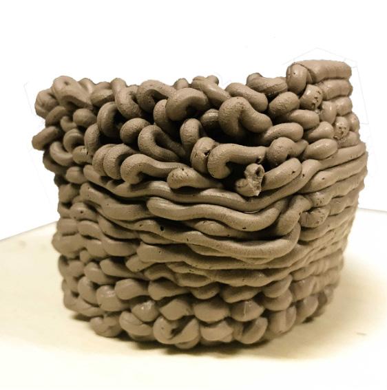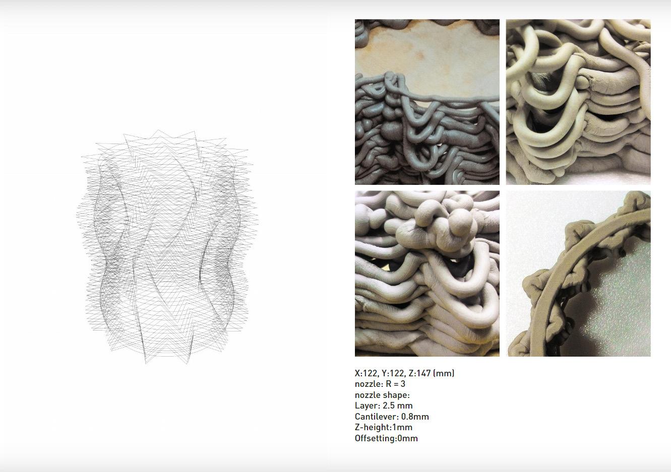 ● Testing - The experiment involved testing how much overhang could clay have during 3D printing. Many unexpected issues surfaced during printing. First, there was insufficient moisture in the clay body; thus, the material could not be extruded successfully. Second, because of material viscosity, shape deformation occurred, leadings to unexpected results.