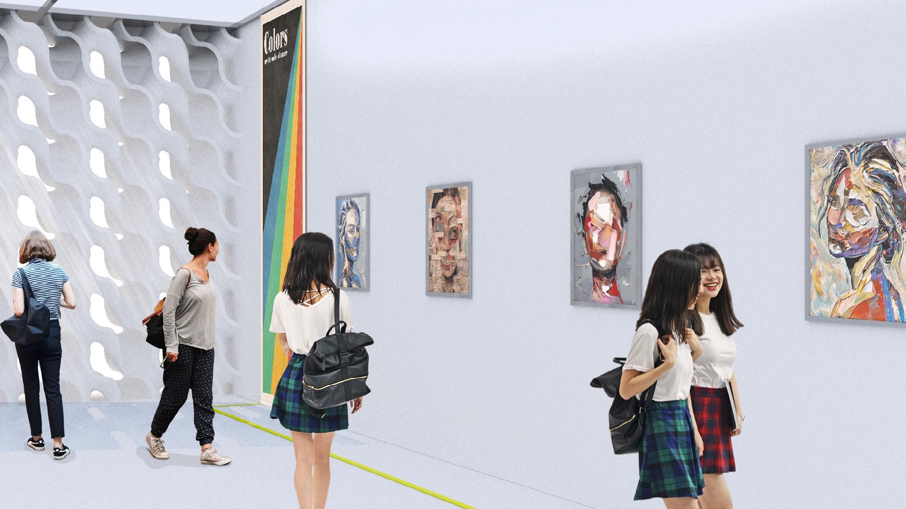 First floor: The ground floor layout plan includes the main entry gate, green area, entry and exit gates, shops and showrooms, visitor information centre, elevators and staircases. The stores on the ground floor sell organic cosmetics because many people, in recent years, have begun opting for organic cosmetics, which are both an environmentally friendly alternative and a wise choice to ensure good health. Therefore, stores on this floor have adopted natural materials in their design to strengthen this concept. The ceiling system uses wheatboard a sustainable material in architecture and interior design. An undulating image of rice ears being swayed by the wind in a rice paddy field is depicted as the ceiling pattern.