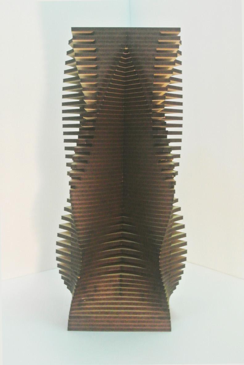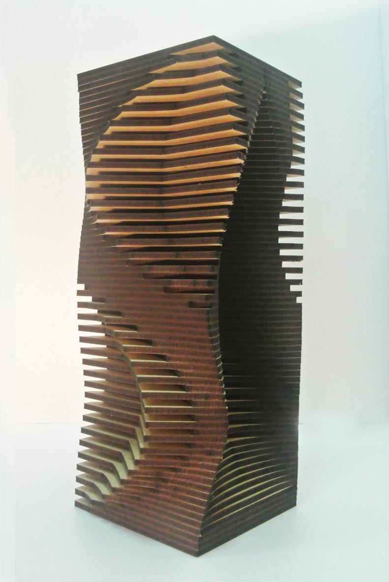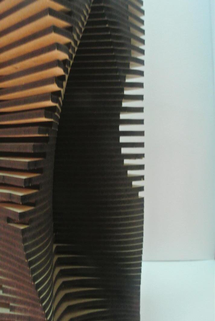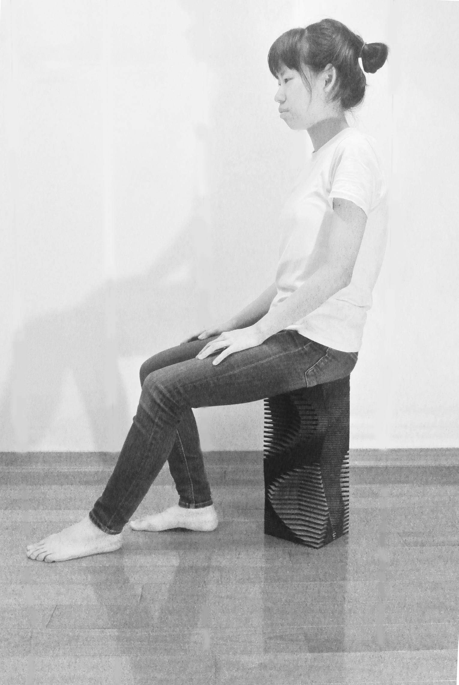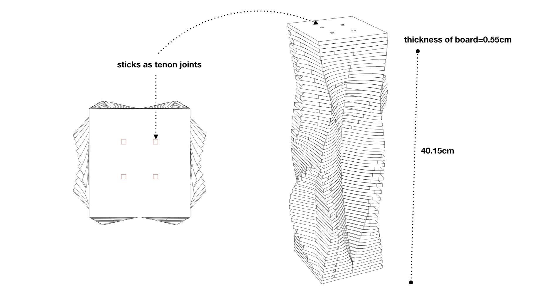 During the manufacturing process, 5.5-mm-thick medium-density fiberboards are used as the material and fabricated using a laser-cutting machine. The Grasshopper plugin is used to assist in creating contours for laser cutting. The finished pieces (73) of wood board are cut within 30 mins, and four square mortises are cut on the middle of the board, where the long wood sticks can be placed inside to reinforce the furniture structure. Even without any adhesive, the structure of the stool piece is very stable and aesthetically pleasing.