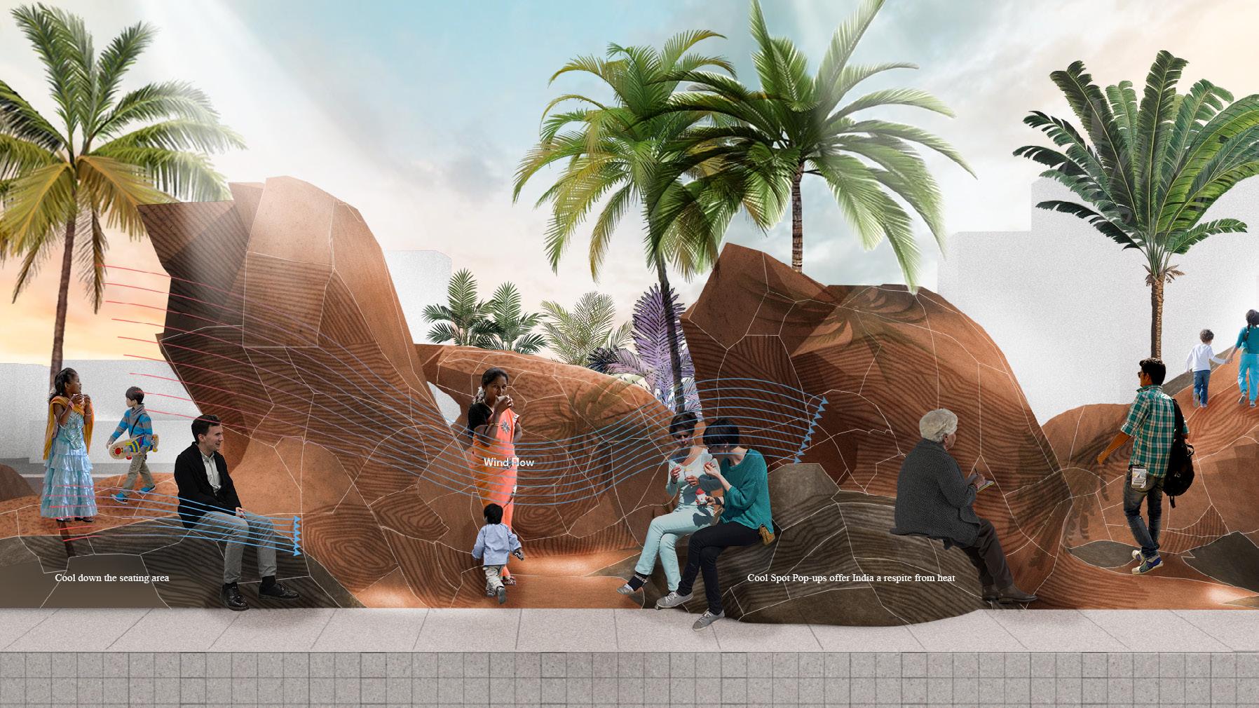 Design: This project applied a robotic cutting workflow to fabricate blocks and place them in the context of hot, semi-arid climates. The blocks were designed as two different prototypes for air cooling and were demonstrated in a public park in India. The cool and warm zones were created by placing various blocks with different carved patterns using the developed tools.