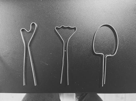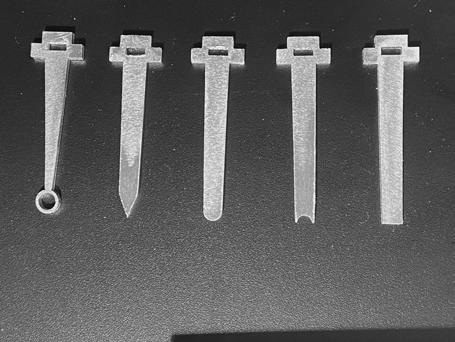 mm aluminium (Fig. 1). During testing, this version performed unsatisfactorily to remove materials efficiency. The problem was that the aluminium plate ring did not clamp the aluminium tool tightly, causing vibrations during clay cutting. In addition, the shape of the tool head affected the cutting efficiency, where the residual clay usually clogged up the hollow-shaped tool. The second version of the tool was made of steel stripes (Fig. 2). It was easy to customise the stripes by bending. However, during fabrication, the material deformed because of inadequate stiffness. The third version of the tool was a conventional loop tool comprising a handle and a thin, narrow metal strip bent into special circular profiles to fulfil different cutting needs, such as size, angle, texture and detail. A 3D printing base was used as the adaptor. This version of the tool was successfully applied for clay carving.