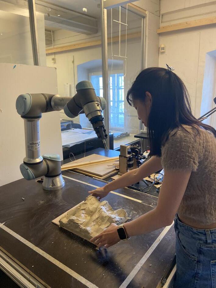 Abstract: This project aims to investigate robotic sculpting techniques for producing blocks to control microclimate. The urban heat island effect currently represents a common and growing environmental concern. Consequently, several studies have addressed the pressing challenge of how the urban microclimate can be improved. In this project, I developed a workflow to employ robotic sculpting tools to create additional surface area on clay. When long channels were carved into the clay, its surface area increased, which in turn enhanced its heat exchange effectiveness. Furthermore, using a robot allowed the design to move beyond the standard blocks during the fabrication process.
