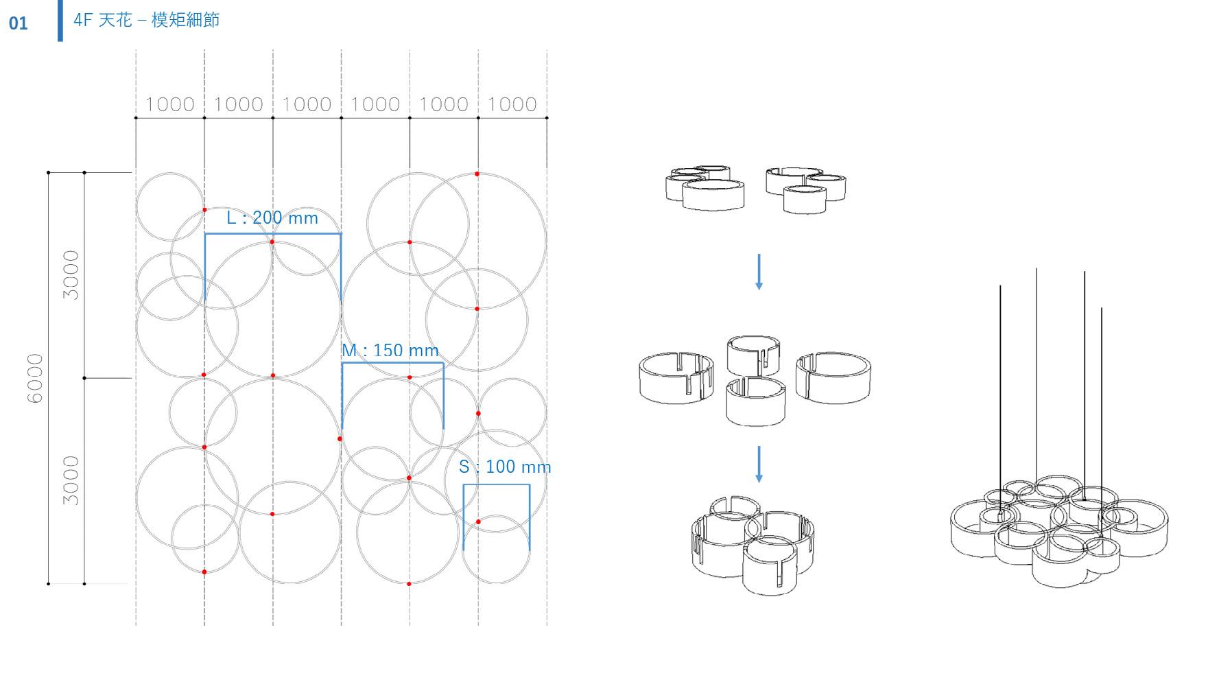 Fourth floor: The design concept on this floor is the clouds. Shopping on this floor, one feels like taking a stroll in the sky. The round metal modules were fabricated in a factory, and the translucent lampshade panels were then mounted on the modules to filter the light. To increase the number of stunning geometric patterns, the modules were overlapped and interlocked