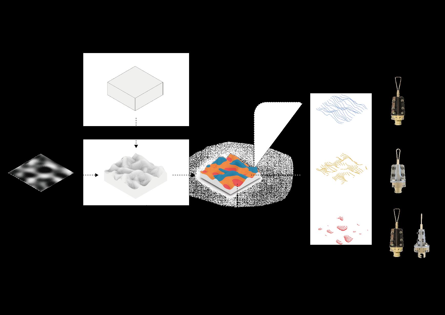 Method: The method draws inspiration from stylised robotic clay sculpting, which was proposed by Disney Research. The technique involves fabricating stylised sculptures in water-based clay using customised tools and serves as an outlet for unique artistic expression; however, the method has not been shown on the architectural scale. Therefore, through this project, I decided to seize the opportunity to develop large scale elements in architecture. The investigation elements include tool design, understanding the material properties/ terracotta cooling effect and robotic fabrication.