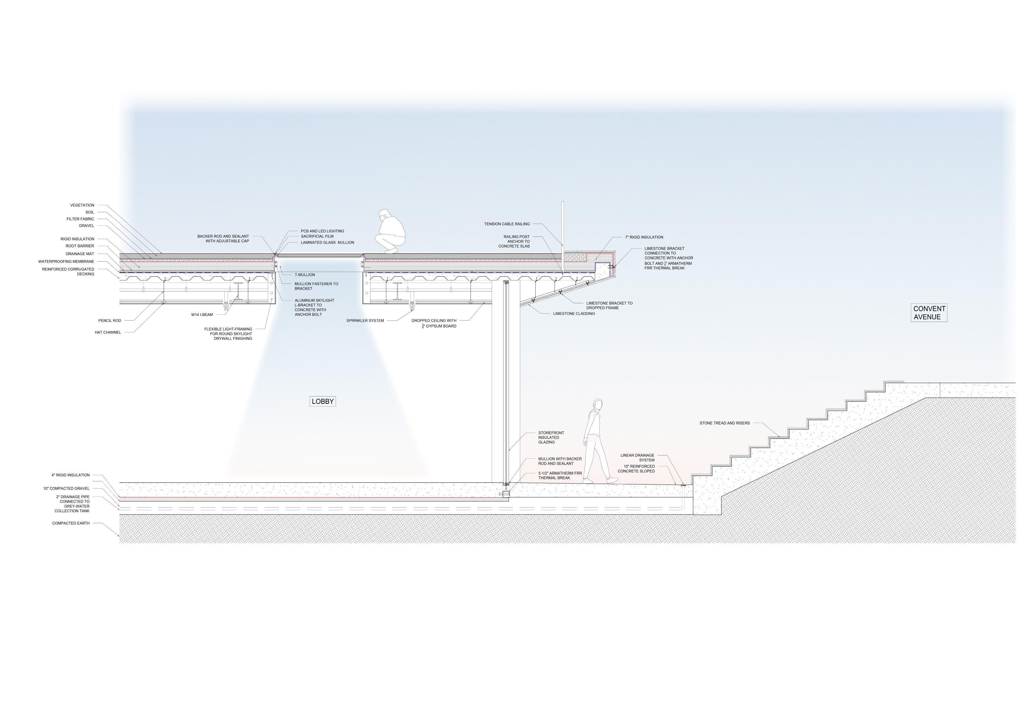 The corten steel panel and fin facade communicates with the interior programming, becoming denser and using more coverage for the classrooms, blocking off more of the visual distractions of city life, then decreasing that density using the fins along the circulation and seating areas. This panel system also allows us to break up the length of our bar and connects back to the green of the plaza by having this creeping ivy grow up onto it.