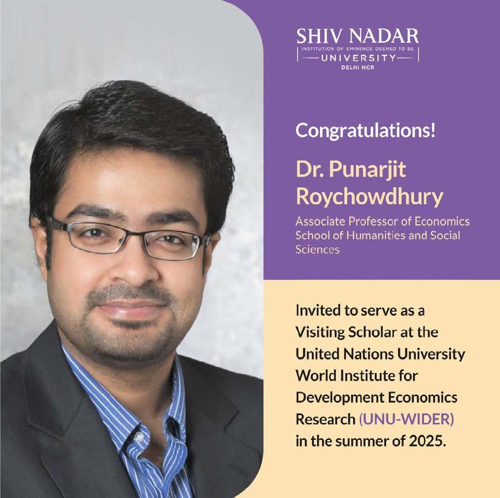 Dr. Punarjit Roychowdhury, Associate Professor of Economics in the School of Humanities and Social Sciences, has been invited to serve as a Visiting Scholar at the United Nations University World Institute for Development Economics Research (UNU-WIDER) during the summer of 2025. The institute conducts cutting-edge policyrelevant research, capacity-building initiatives, and knowledge dissemination to inform decision-making on pressing global issues such as inequality, poverty, economic transformation, and climate change