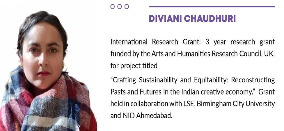 Dr. Diviani Chaudhuri, Assistant Professor, Department of English, has been awarded a threeyear International Research Grant funded by the Arts and Humanities Research Council, UK, for the project titled “Crafting Sustainability and Equitability: Reconstructing Pasts and Futures in the Indian creative economy.”