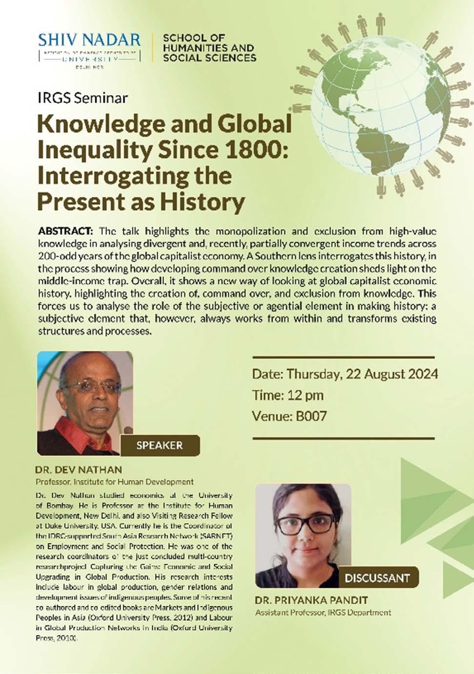 The Departments in the School of Humanities and Social Sciences offer undergraduate and graduate courses, such as Growth and Inequality (ECO 425), Poverty and Inequality (ECO 392), Hierarchy, Difference, Inequality (SOC 120), Issues in Water Policy, Discrimination, Exclusion, and Conflicts (WSP510), Economics of Discrimination (ECO 684), Economic Development (ECO 415), Interrogating Histories and Theories of Economic Development (INT 202), Development Economics (ECO 605),