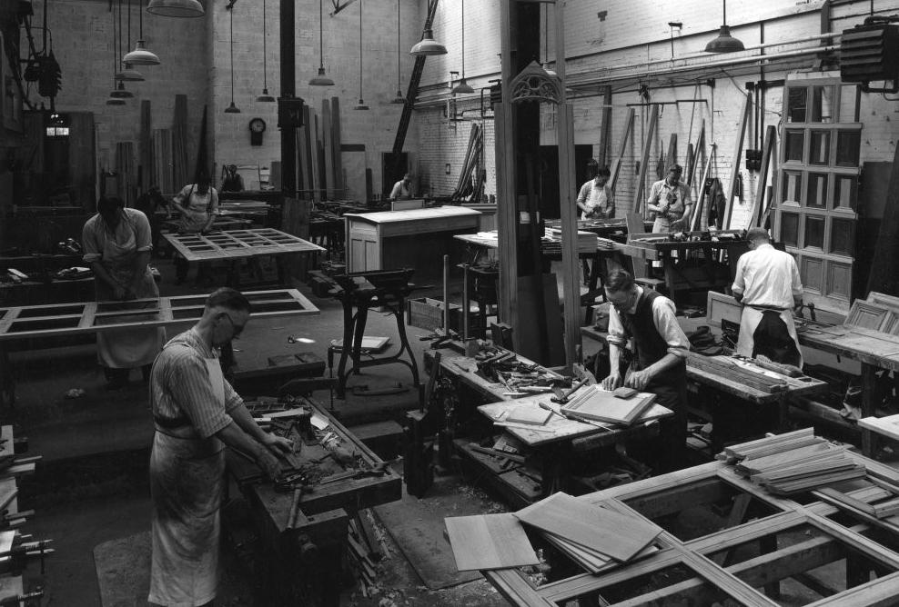 Fig 06. (Previous) Craftsman in the workshop making frames for furniture. J. L. Green & Vardy Ltd, 79 Essex Road, London, 1930s. Source: RIBA Collections